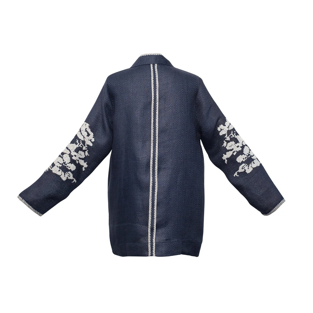 The Cielo Jacket is made of flowy linen from the South of India. This sky blue kimono style jacket features soft hand-embroidered flowers on each sleeve.