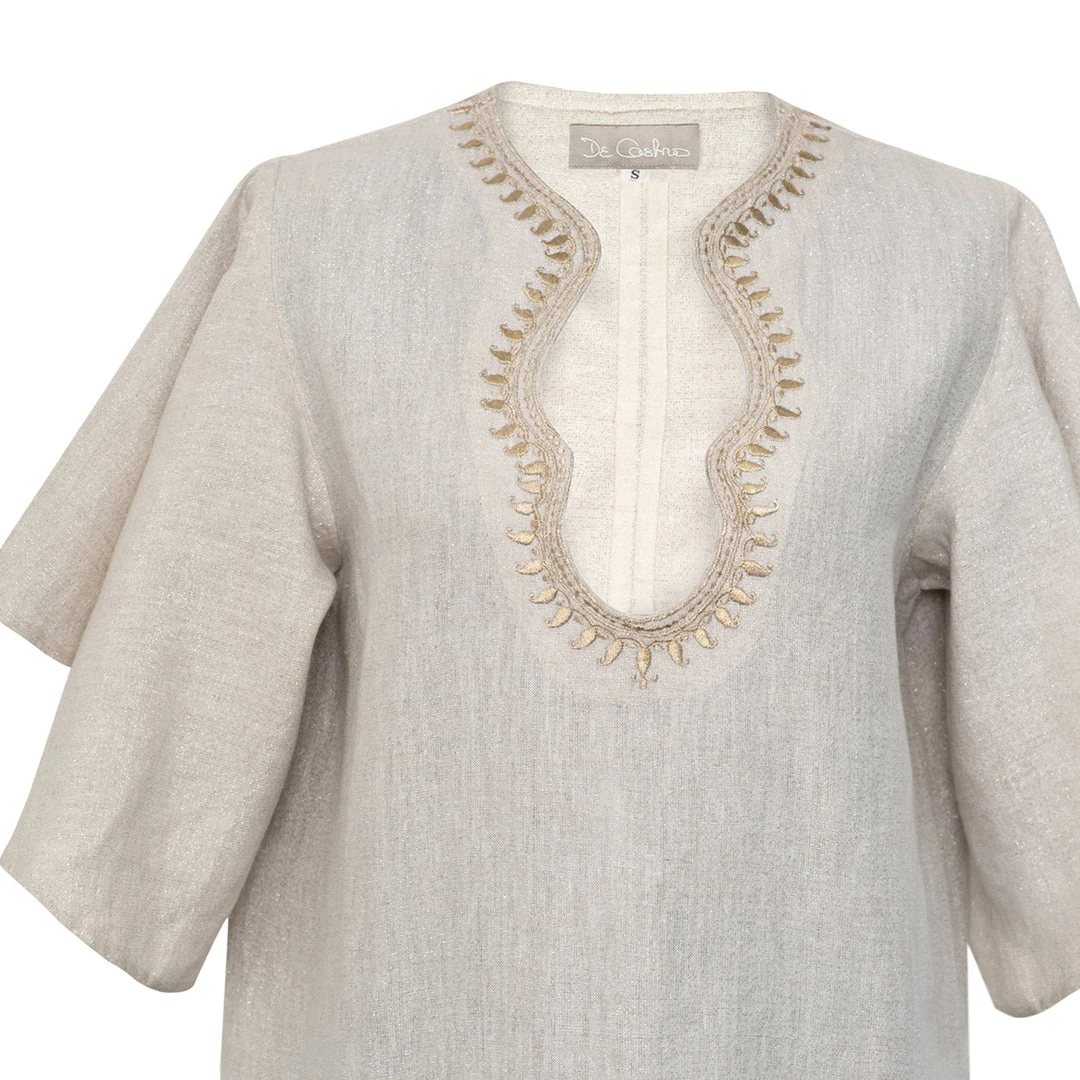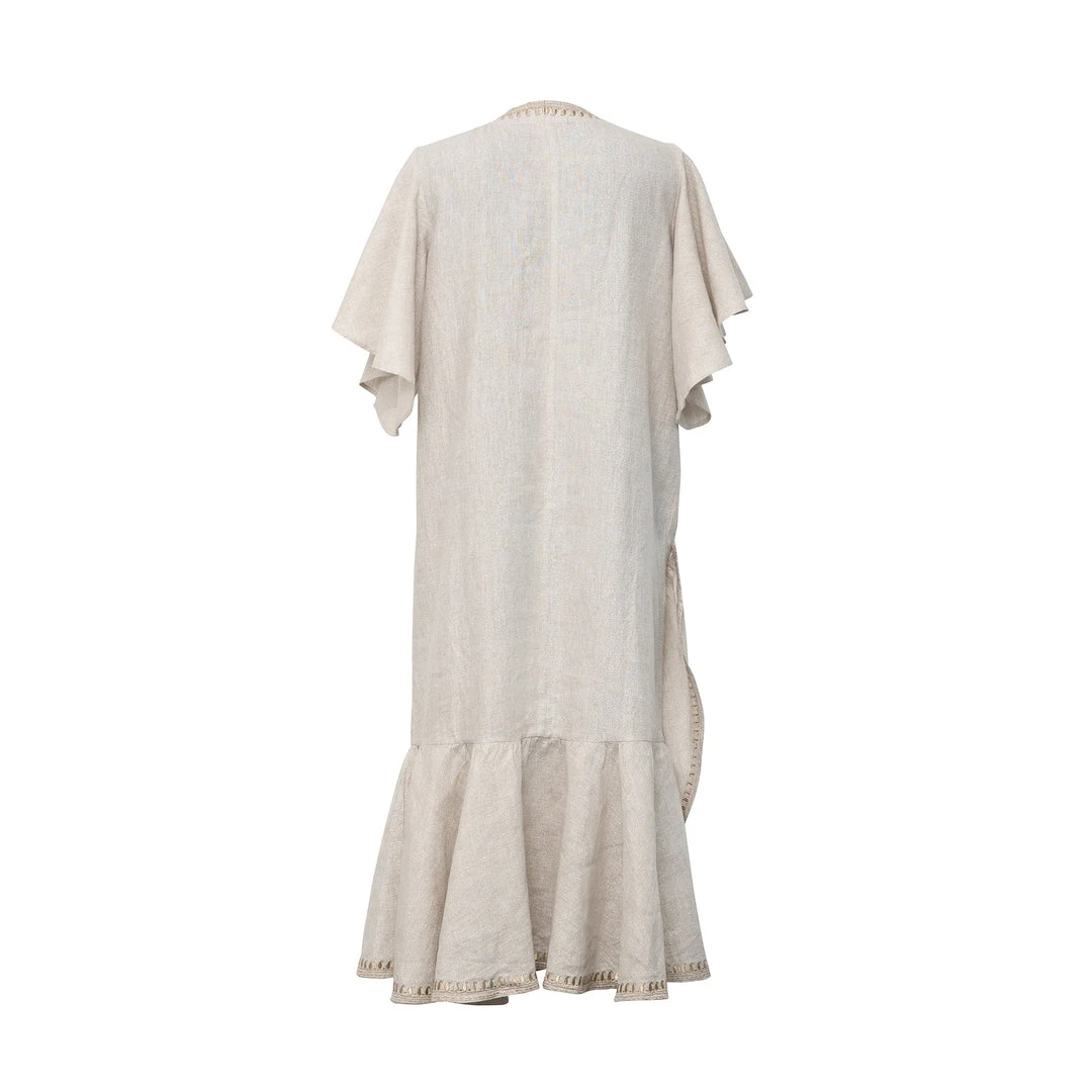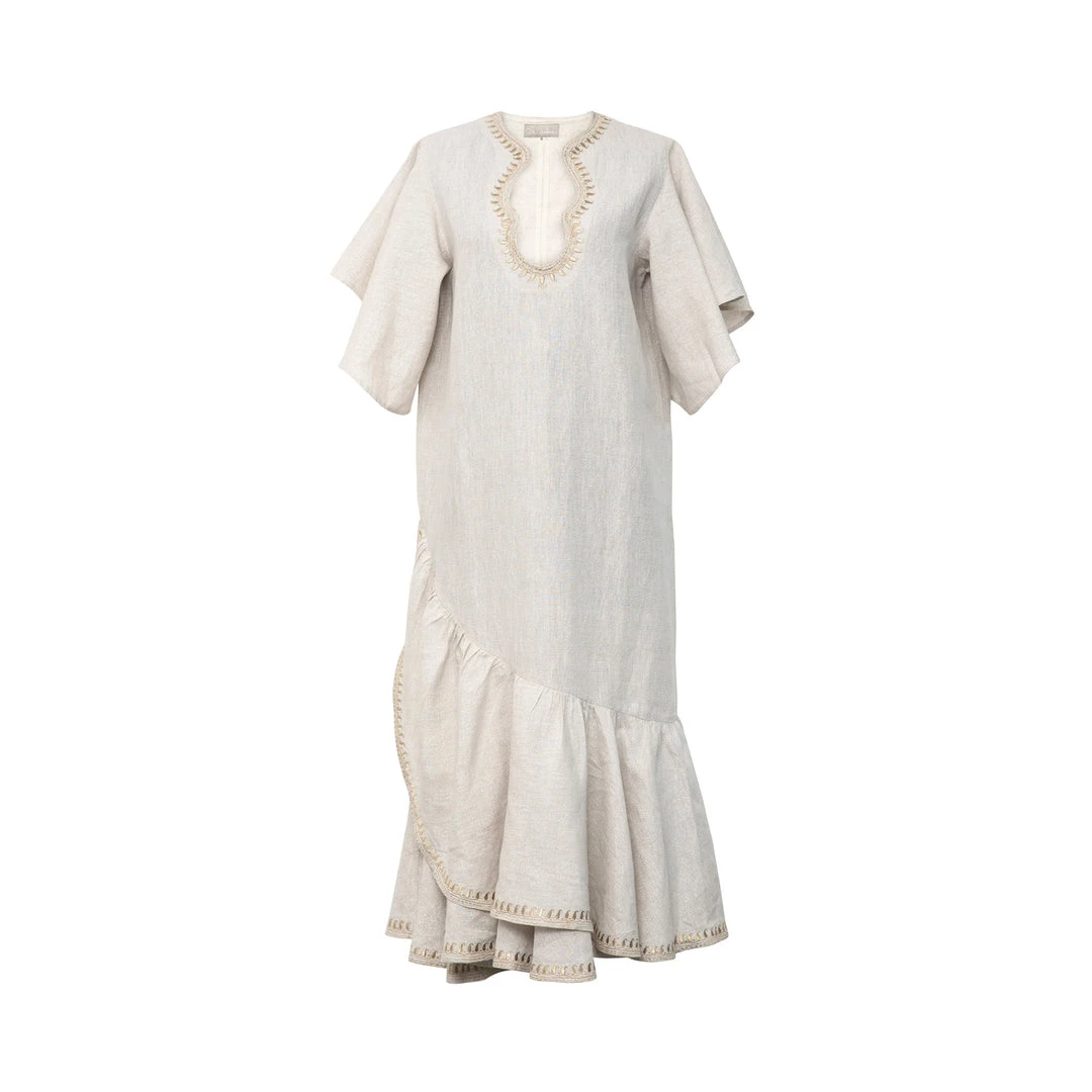 The Dorado dress is made of off white handloom cotton from India. It features metallic gold embroidery around the deep neckline, ruffle sleeves and slanted bottom ruffle.