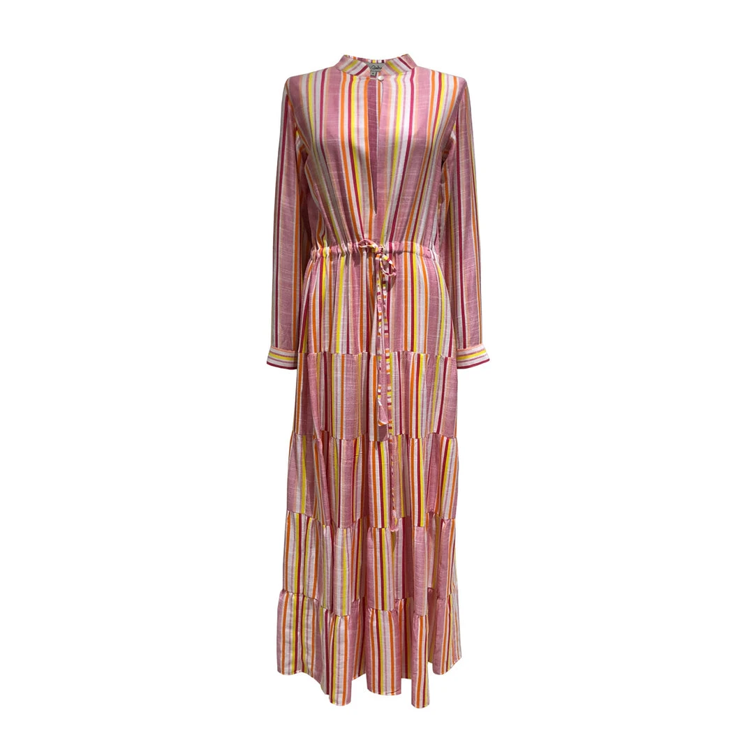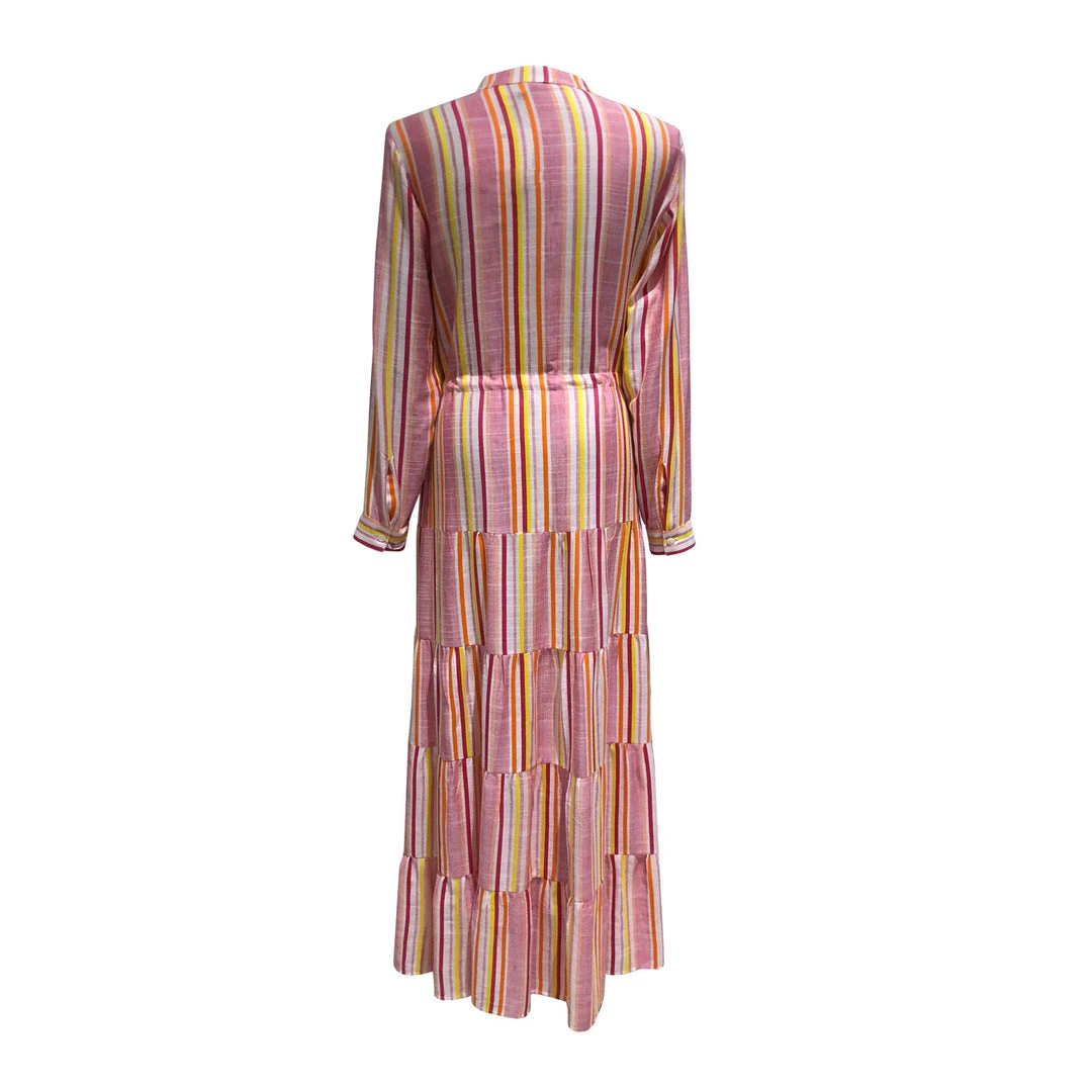 The Stripe Dueña dress is made of cotton from India. This confortable dress features long sleeves, mandarin collar, long sleeves and pull waist string.