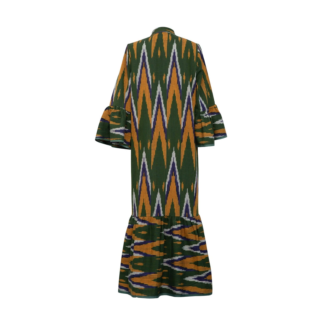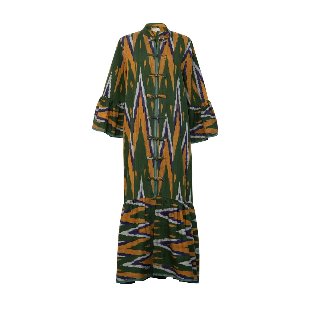 This tunic dress is inspired by traditional Chinese outfits. It is made of Indian Ikat, and it features Chinese knot buttons in the front.