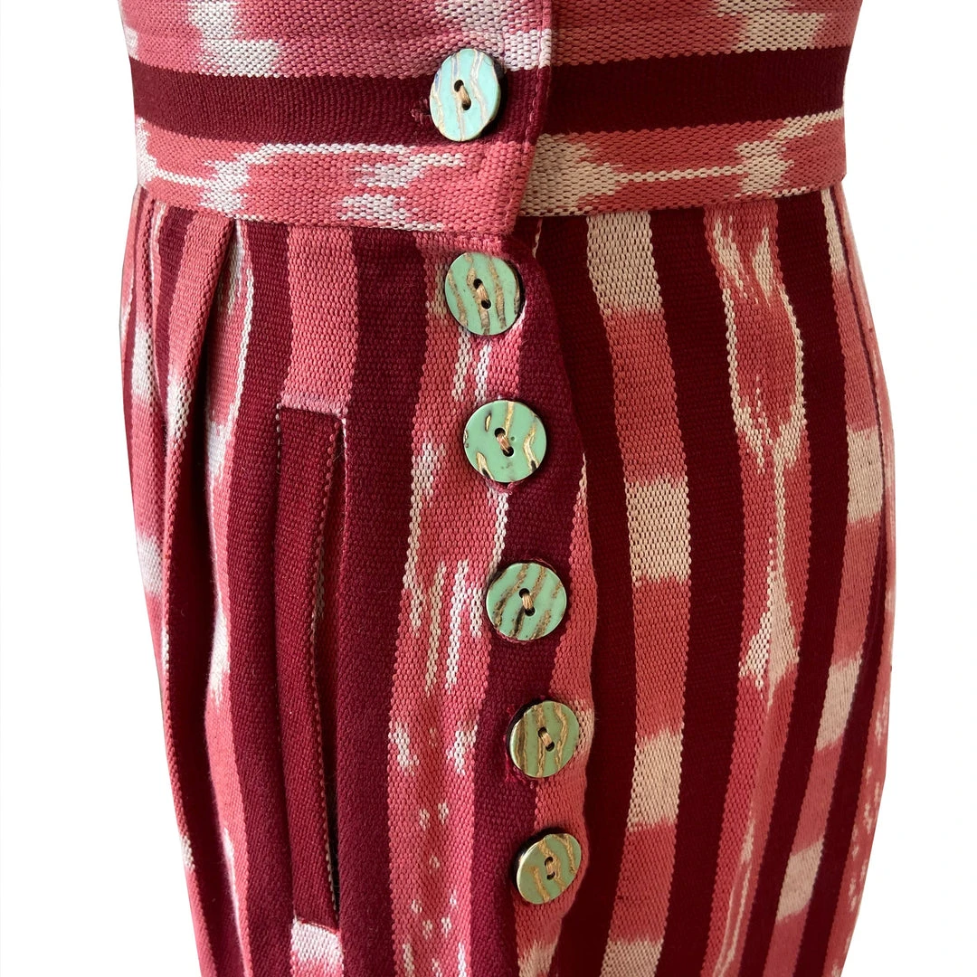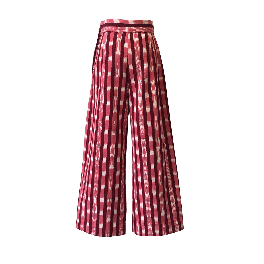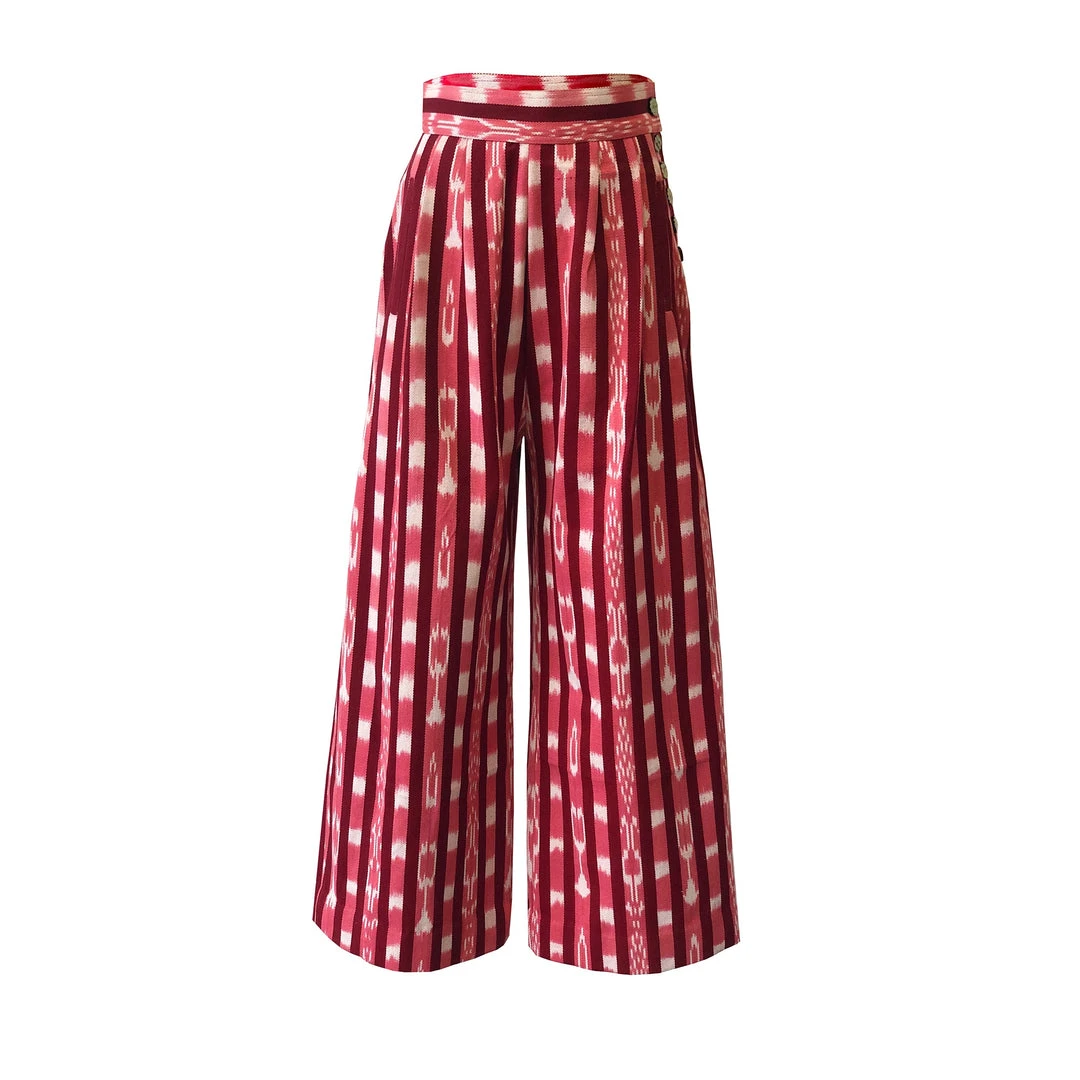 These trousers are made from 100% Ikat cotton, woven in india. The fit is a traditional tailored  silhouette- high rise, straight leg and has a generously wide cut with pleats coming from the waist to the hip to add volume.