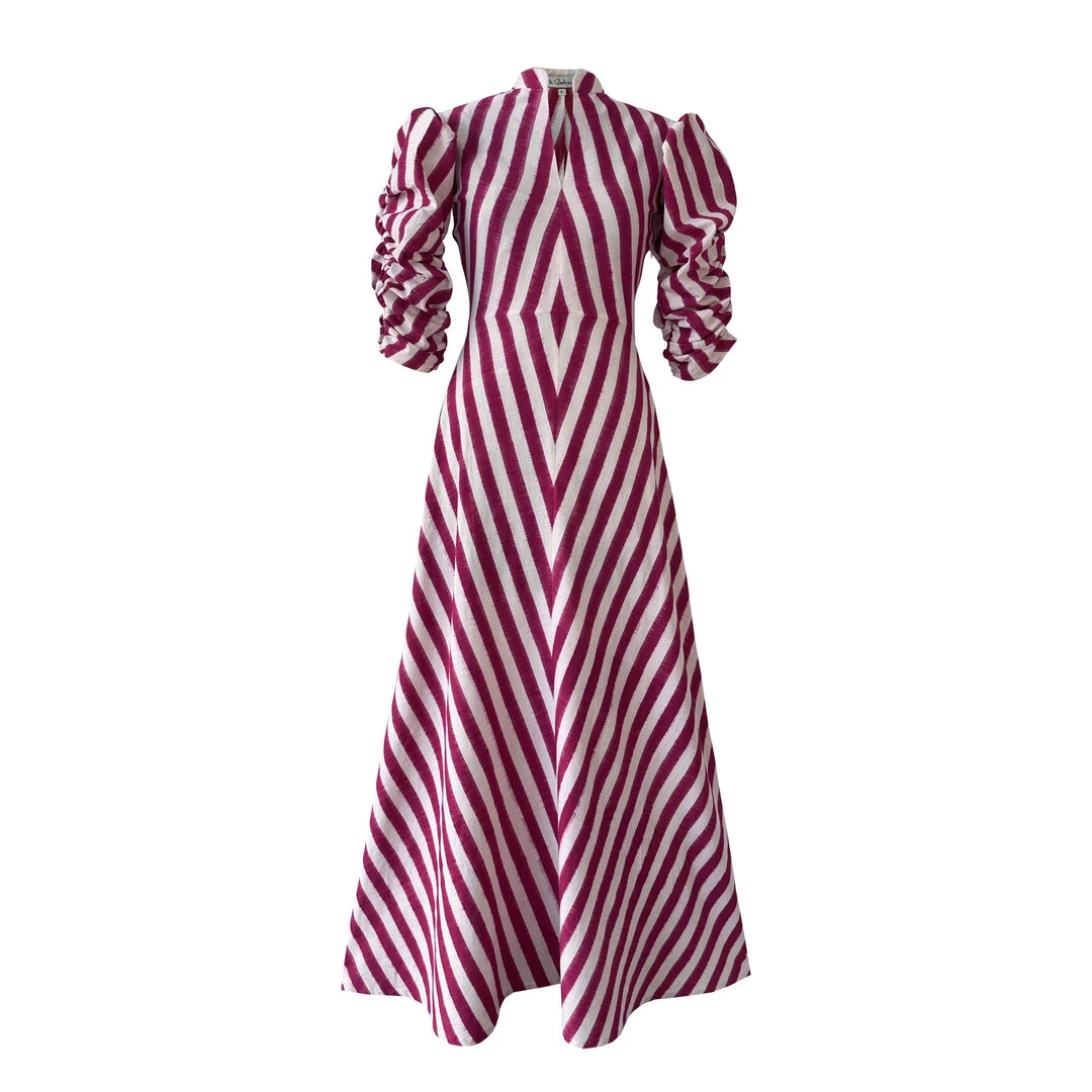 The Rosa Illusion dress is made of double Ikat from the south of India. This playful maxi dress features white and fuchsia stripes, mandarin collar and puff gathered sleeves.