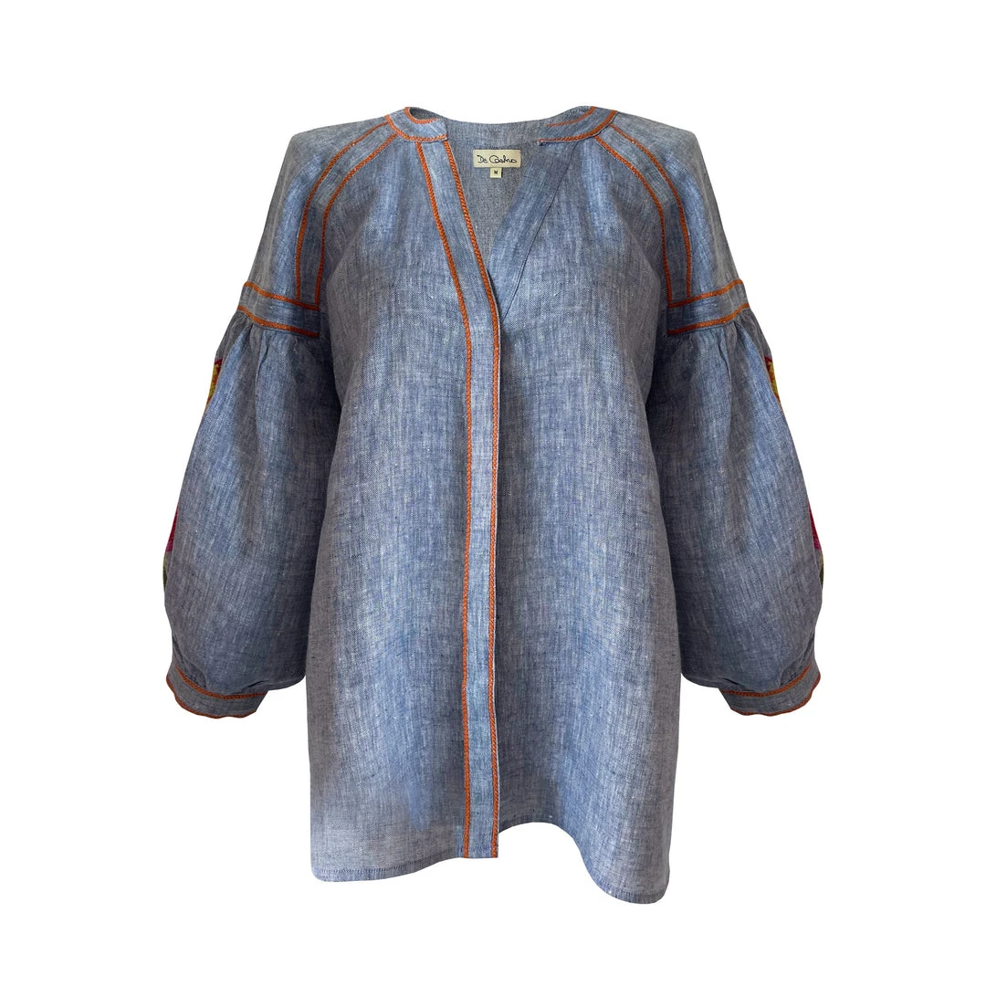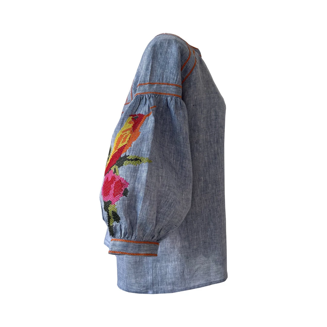 This crisp blue linen shirt with hidden front buttons, features puff sleeves and hummingbird embroidery.