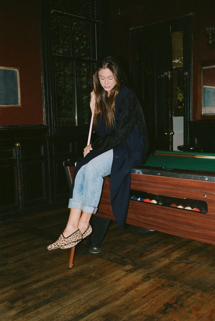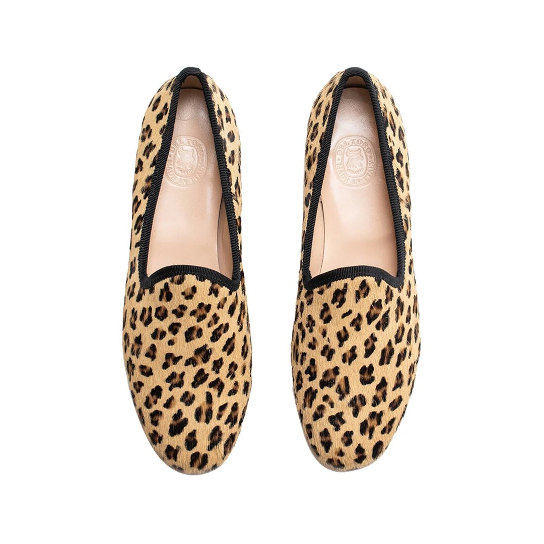 Pony hair leopard print slipper with heritage Del Toro red stripe on back of shoe. This slipper fits true to size.