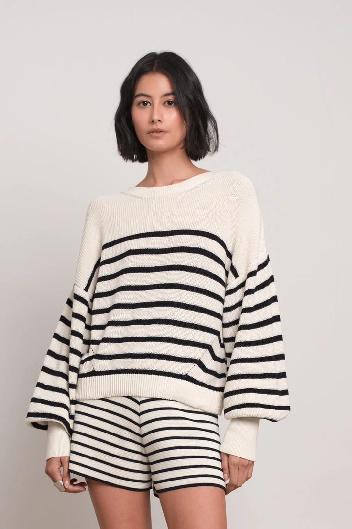 The Layla is ELEVEN SIX’s easy-to-wear fashion-staple Spring sweater. With a feminine blouson-sleeve, and slightly cropped, relaxed body-proportion, she can pair back to your favorite waisted pants perfectly, making you feel both elegant, yet relaxed. The classic fisherman rib-stitch gives an effortless and transitional sensibility. Also available in Sand, Sugar Pink, Spearmint & Ivory.