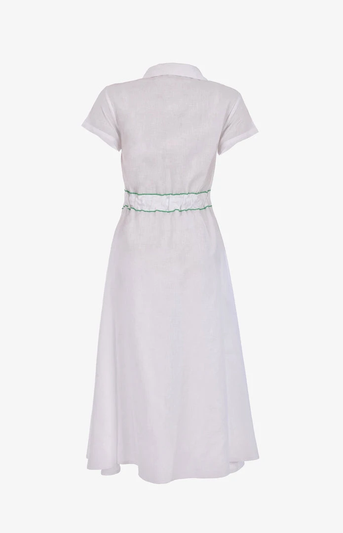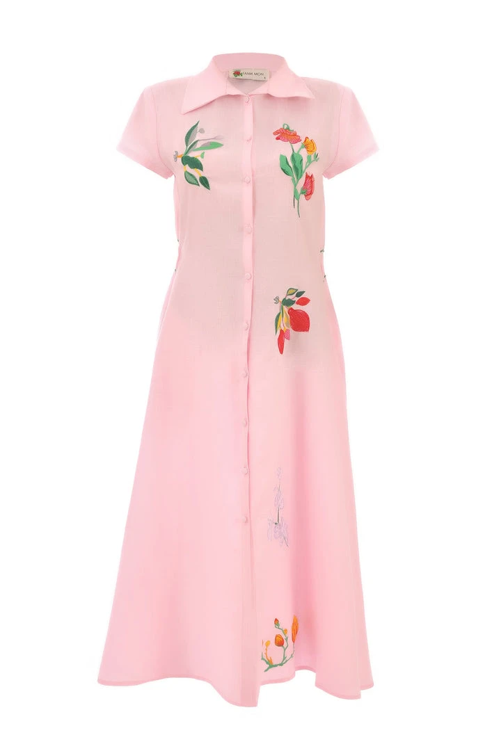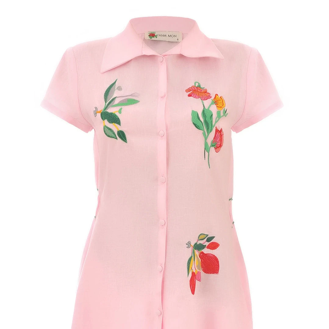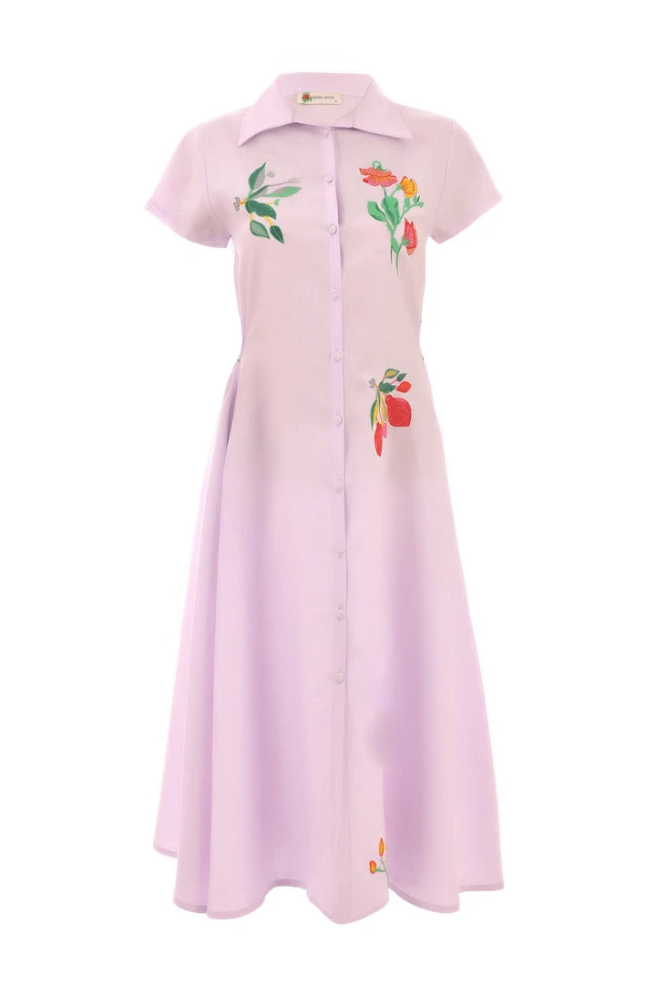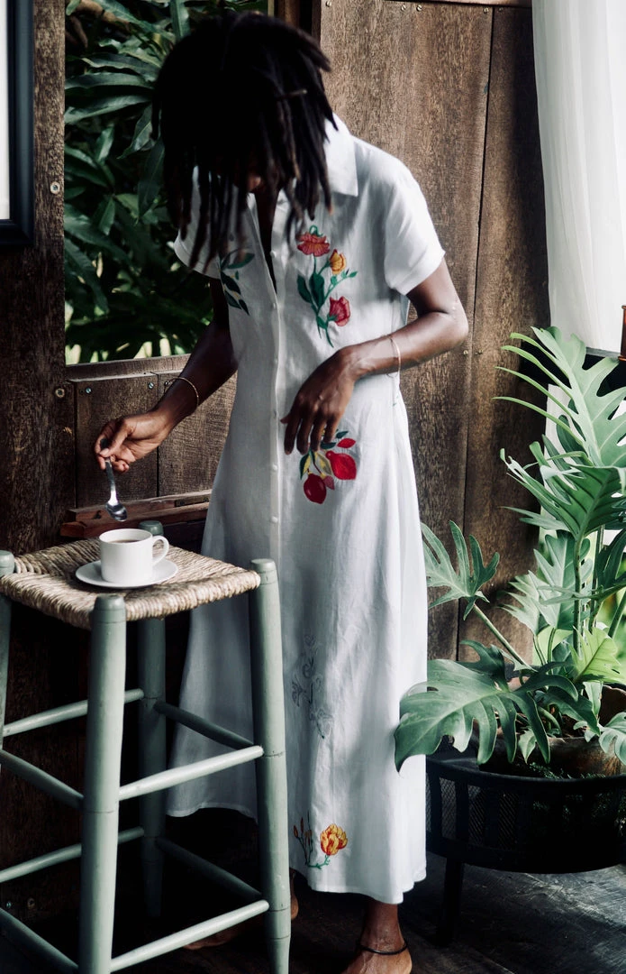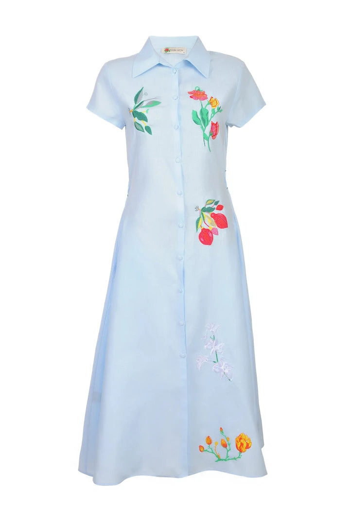 Midi Linen Shirt Dress with Front Button Detachable Belt Floral Embroidered