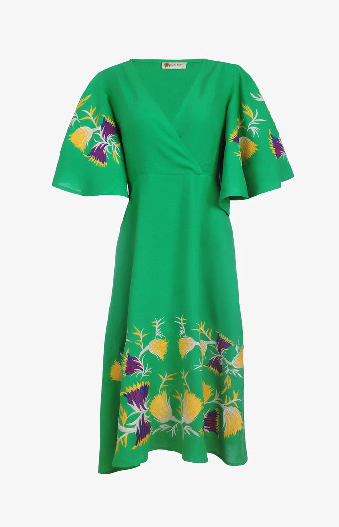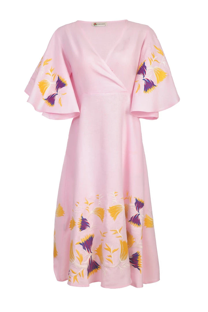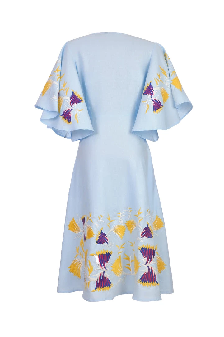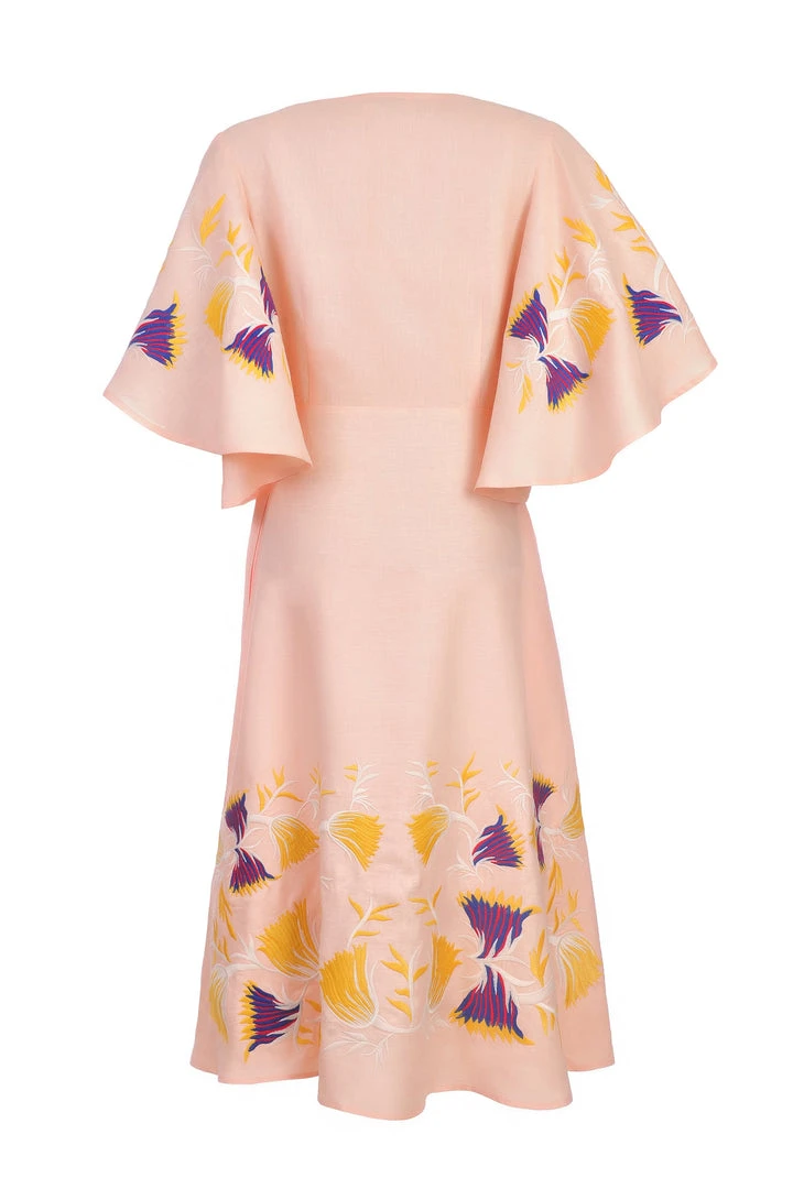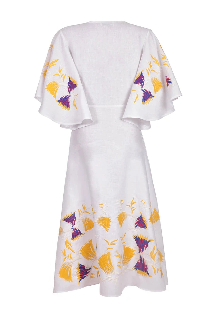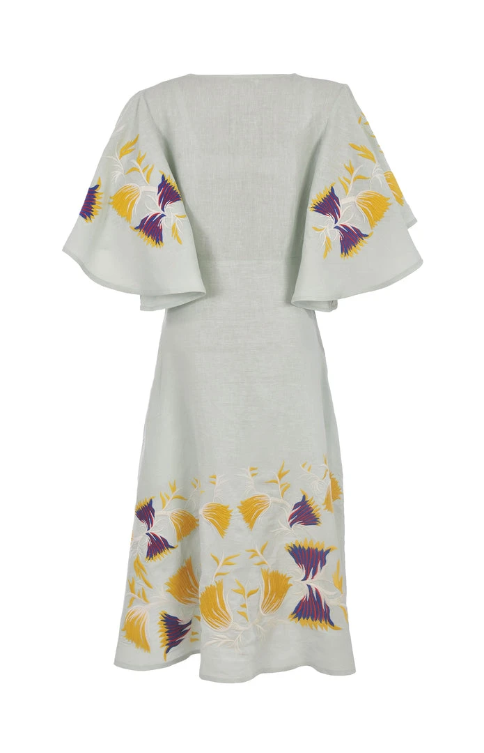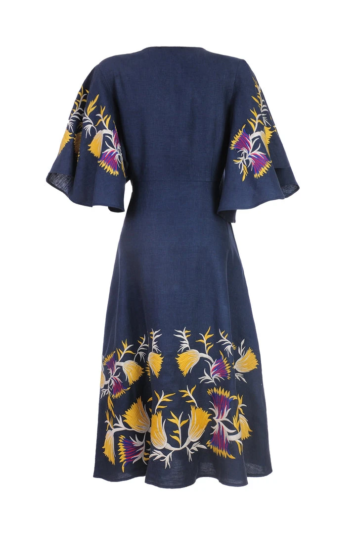 Midi Linen Faux Wrap V Neck Dress with Embroidery