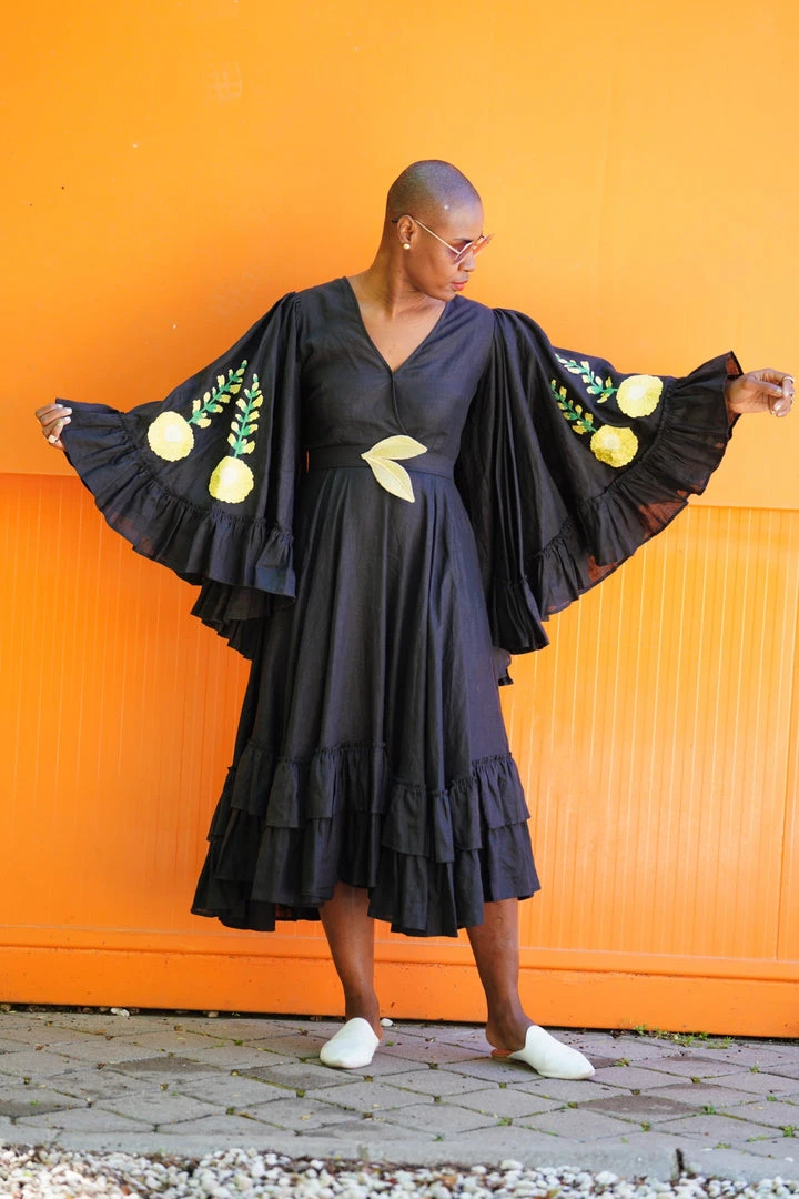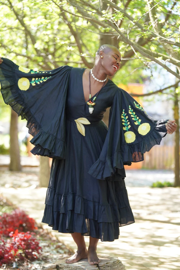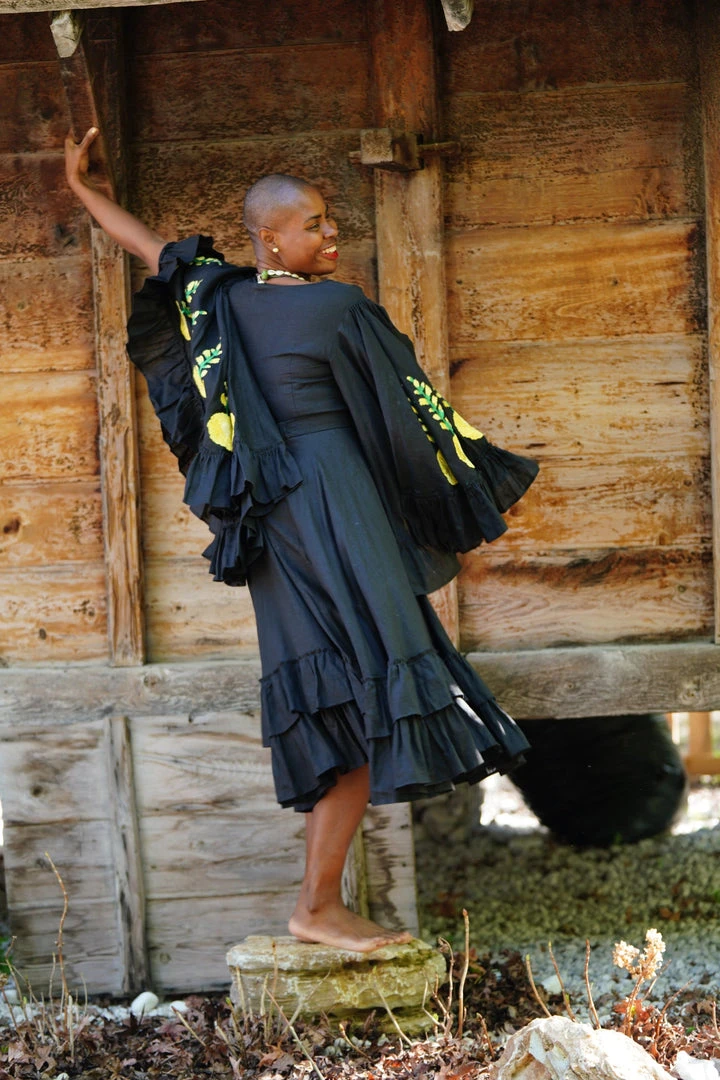 Spanish Style Yellow Floral Embroidered Midi Dress