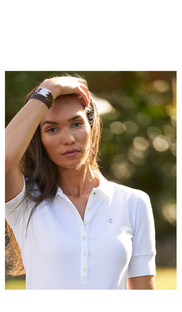 The softest, most elegant polo created thus far. The Sable has an extended narrow placard with petite buttons. The Juliette has longer sleeves than your average polo and a lengthened cuff which visually and functionally slims the arm. The Sable silhouette is fitted with an hourglass shape for femininity unlike all the boxy polos you’ve had. This promises to be a shirt you want to live in, play in all while looking glamorous.