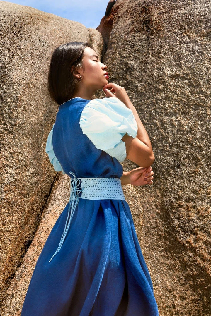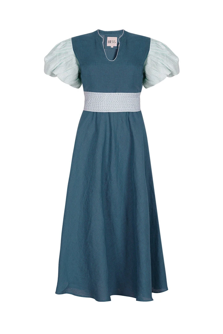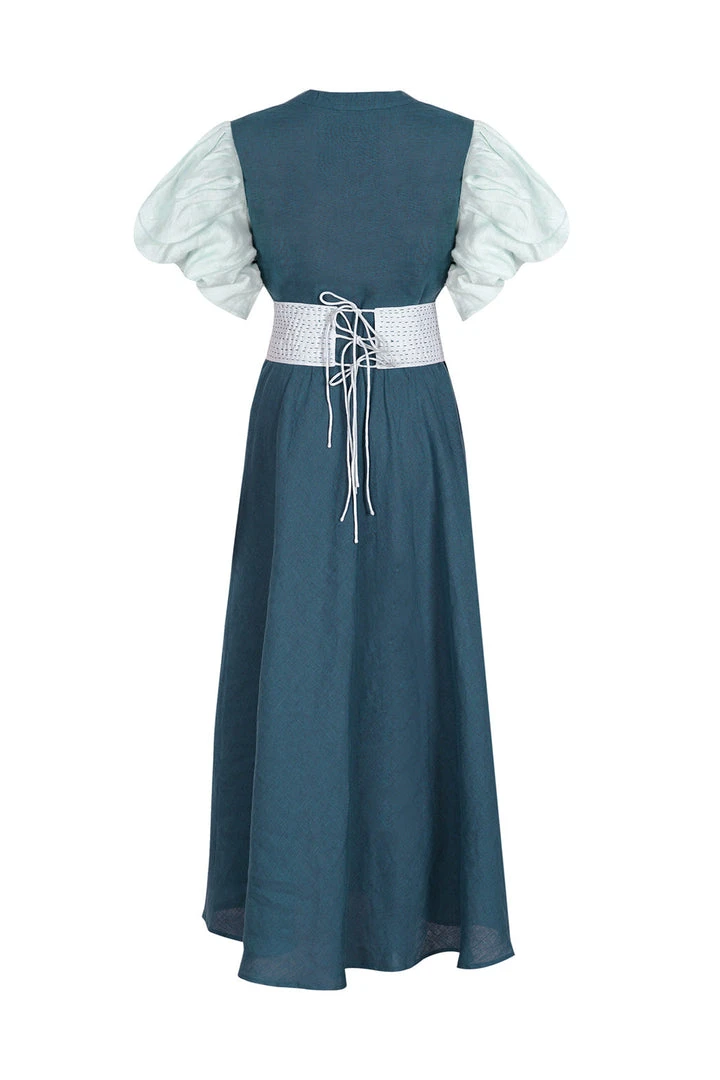Designed with the notion of easy elegance and an 80’s twist, our Alaya Linen Dress is a midi silhouette with flowy A-line cut and contrasting accents, crafted from 6 meters of pure linen in shades of blue.