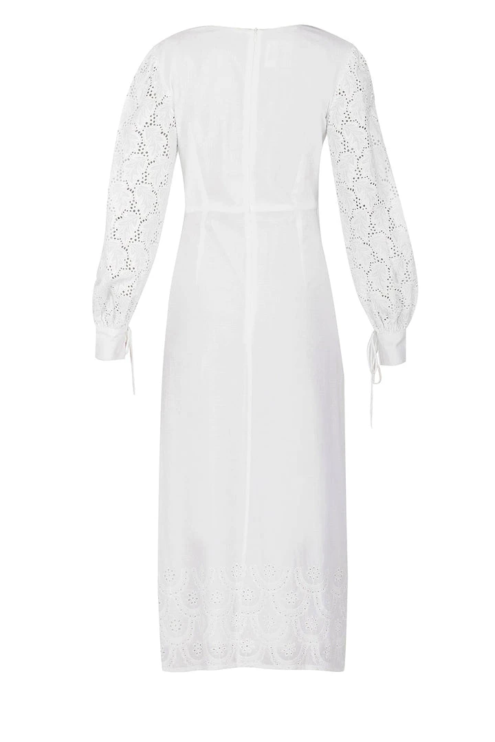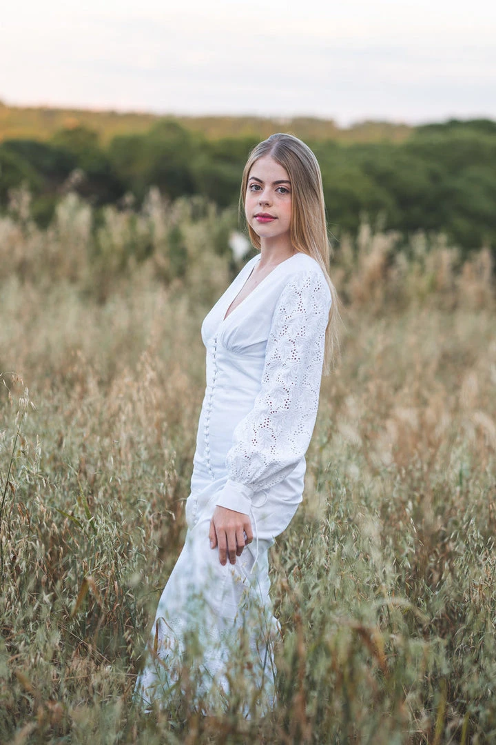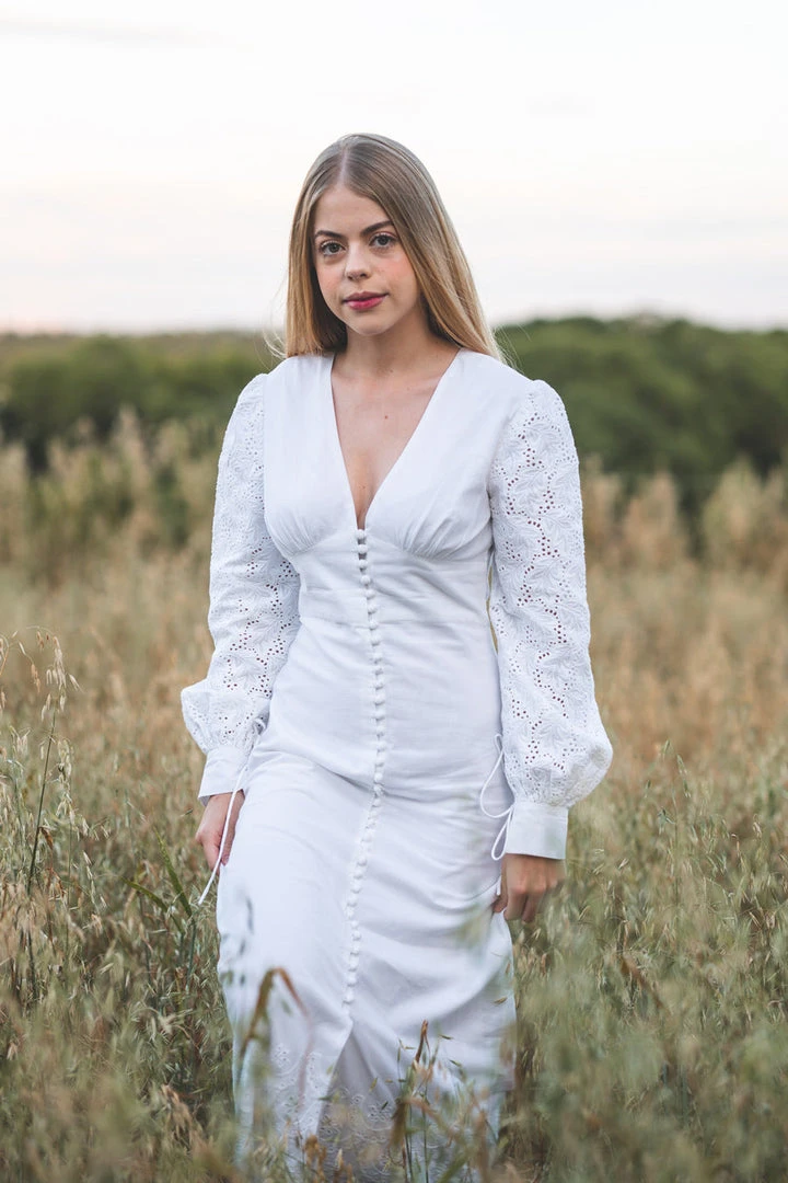 Inspired by long summer days in Bahia, Brazil, the Bomfim Dress is crafted from broderie anglaise to a fitted and feminine shape. It features a pointed band delineating the waist and dozens of handmade fabric buttons adorning the body.