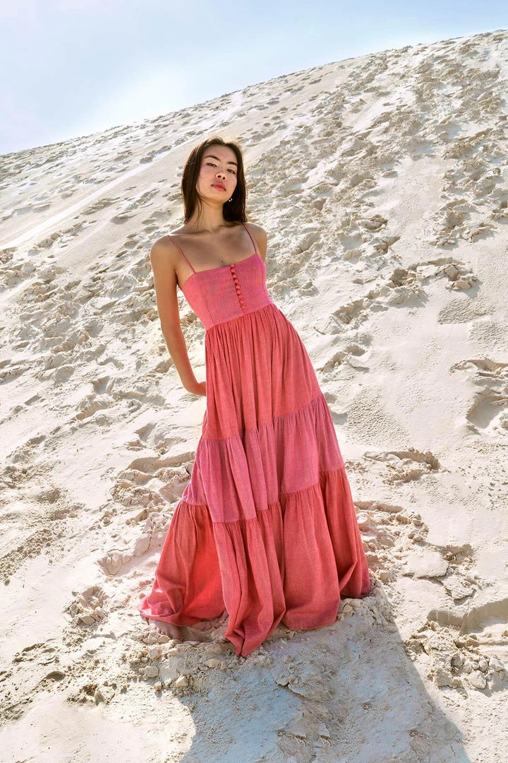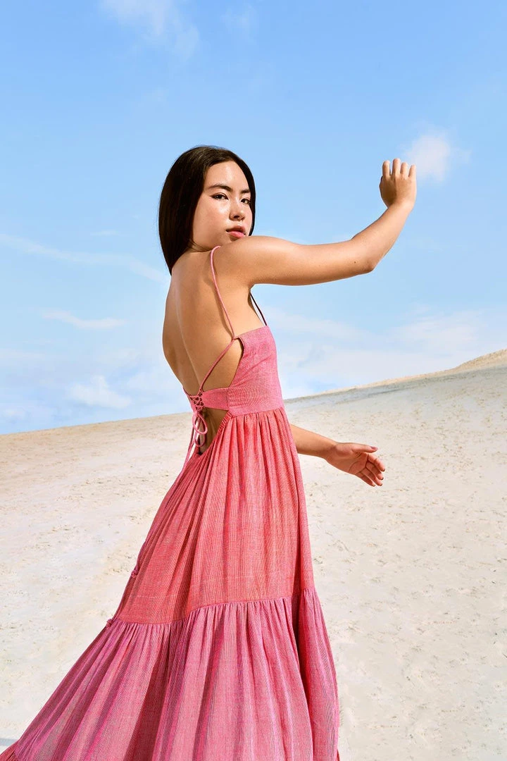 The sweeping silhouette of Hess’ Seville Maxi Dress is accentuated by a full open back adjusted with a corset inspired belt.