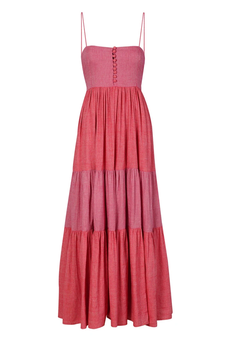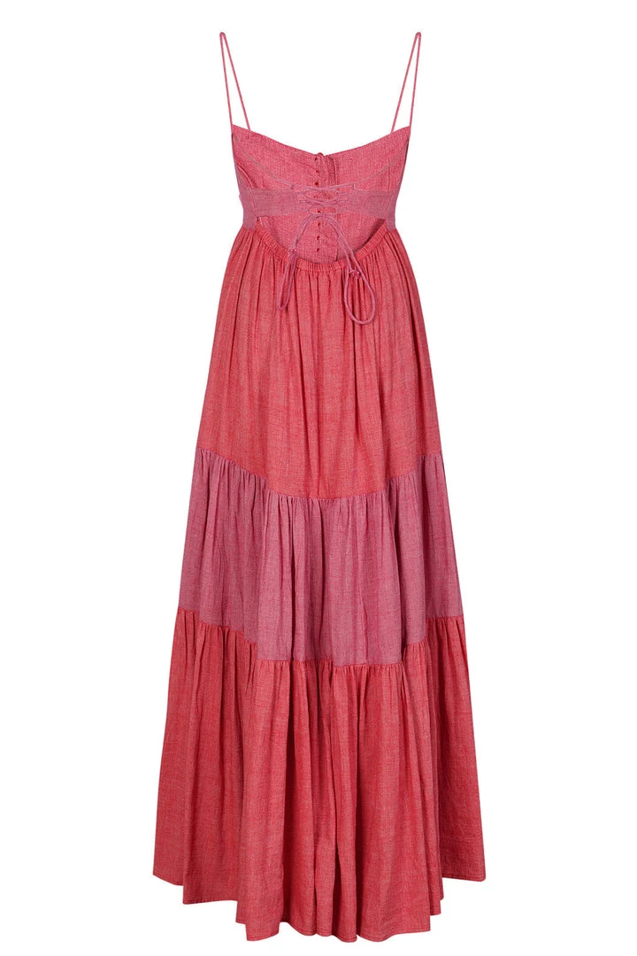Mixing shades of red and pink, the tiered color blocking silhouette is entirely handcrafted from hand-spun and handwoven cotton, sourced from West Bengal.Â