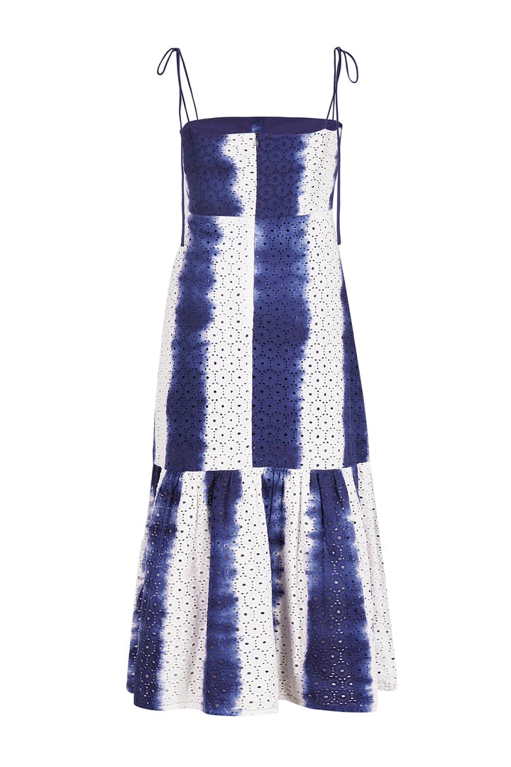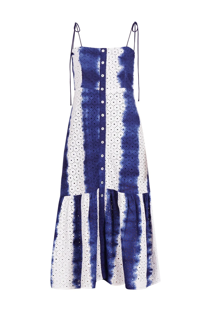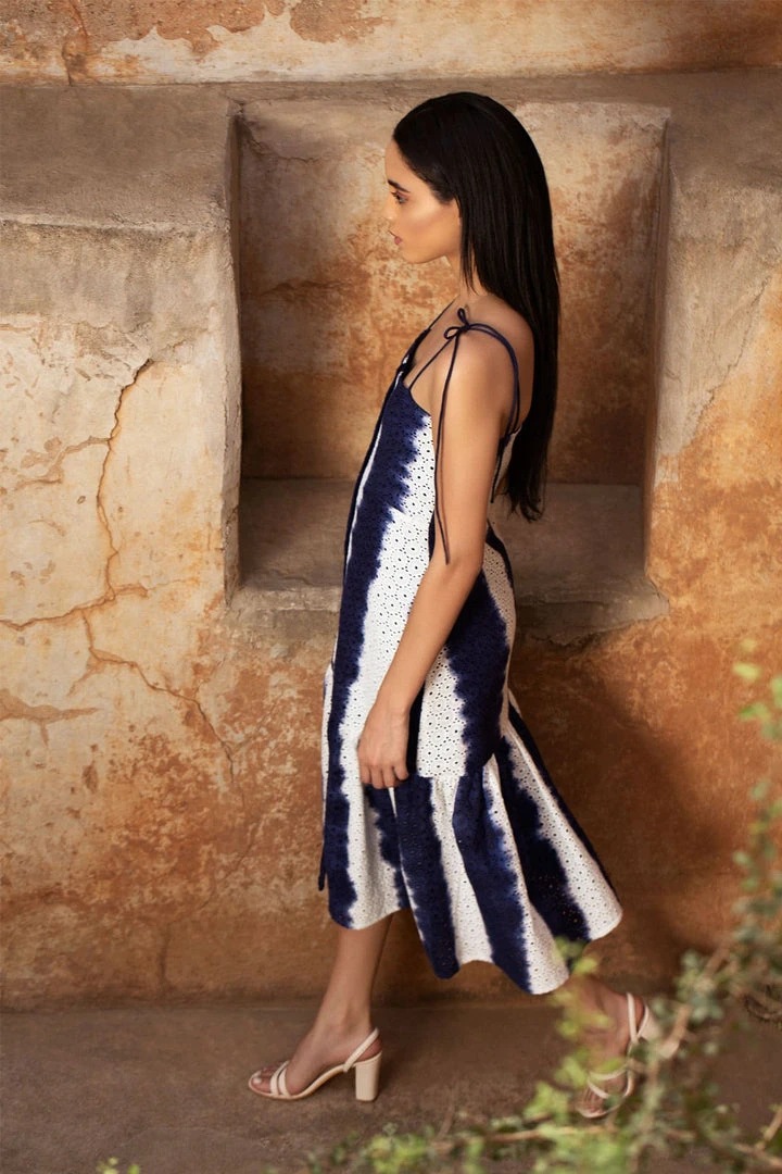 The Marbella Tiered Dress is a midi silhouette with tiered hem and straight neckline adorned with thin straps. Crafted from pure cotton broderie anglaise, this design is hand-dyed in Jaipur using a traditional technique called shibori.Â