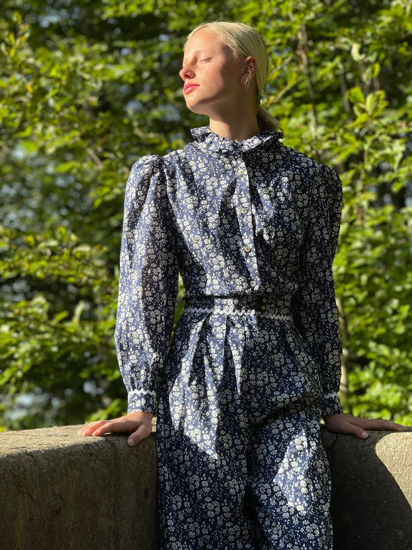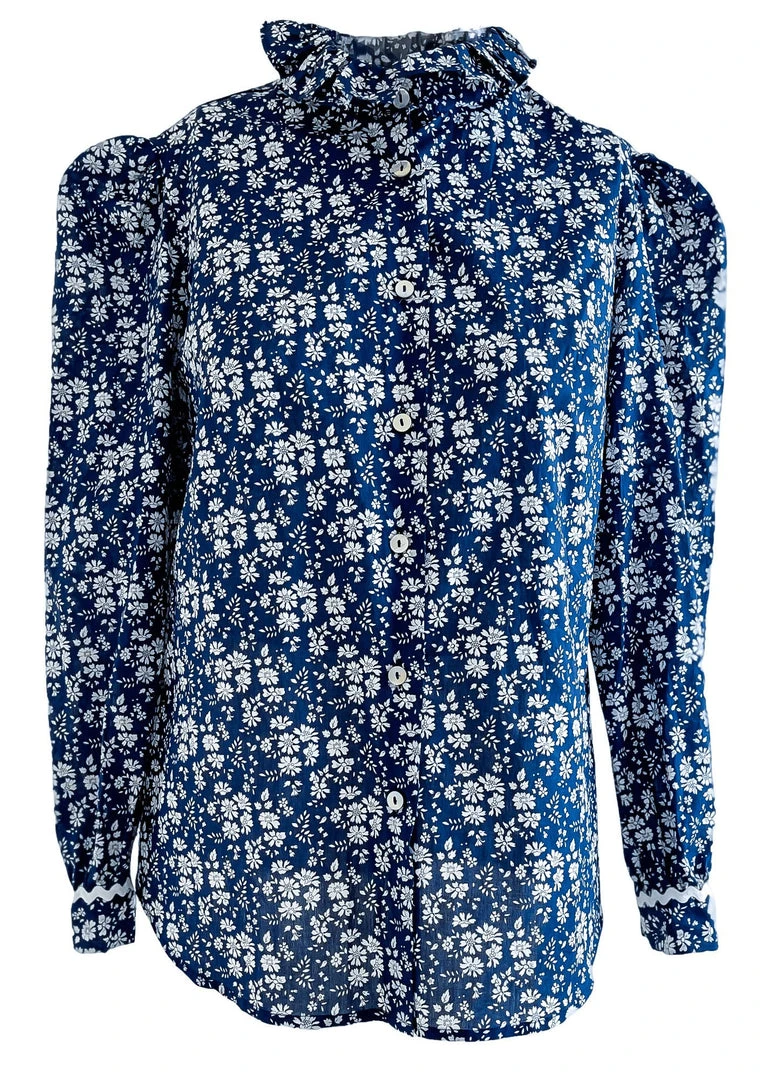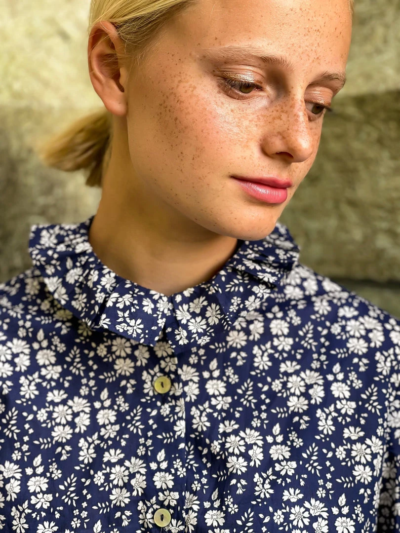 The Rhodos Blouse is the follower edition of our Elba Blouse and is an absolut classic. This beautiful piece in navy with white flowers, has a little high neck collar and puffed sleeves. Handcrafted in a small family atelier in Spain. We used the most beautiful Liberty Fabric (100% Tana Lawn Cotton). Limited edition, ready to ship.
