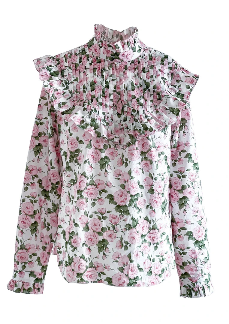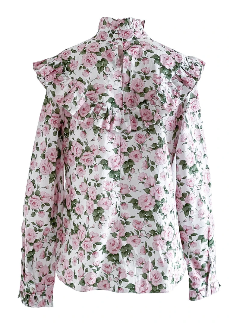 The Rose Blouse is in itself a statement piece and will upgrade your favorite blue jeans or midi skirt. With delicate flowers in light rosé, Rose will instantly give you this spring feeling you were missing all winter long. Beautifully pleated with ruffles on chest and cuffs as well as a little high neck collar. Handcrafted in our atelier in Bavaria and made with 100% Tana Lawn cotton from Liberty London. Model is wearing a size XS (true to size). For pre-order only (takes about 2 weeks)