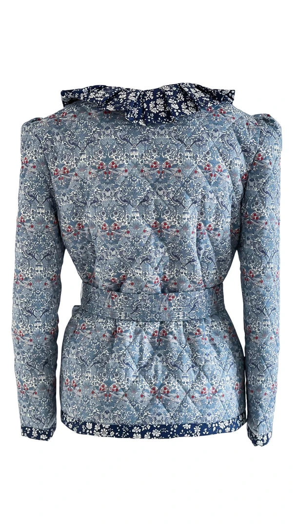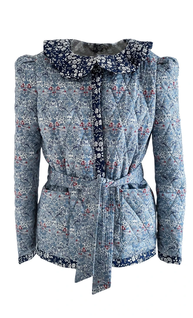 The Rossignol Quilted Jacket, will be your best friend for colder Spring/Summer nights. Beautifully quilted and with a pleated collar, this statement piece will defenetly upgrate every blue jeans Look. You can combine this Jacket with the “Rhodos” trousers or with the “Matin d’été” dress. The Rossignol Jacket is Handcrafted in our Atelier in Bavaria and made with two colors of Liberty fabrics (100% cotton). Two front pockets and a belt to give it more structure (the belt is removable) and hidden front buttons. Puffed sleeves will give this unique girly touch. Ready to ship.