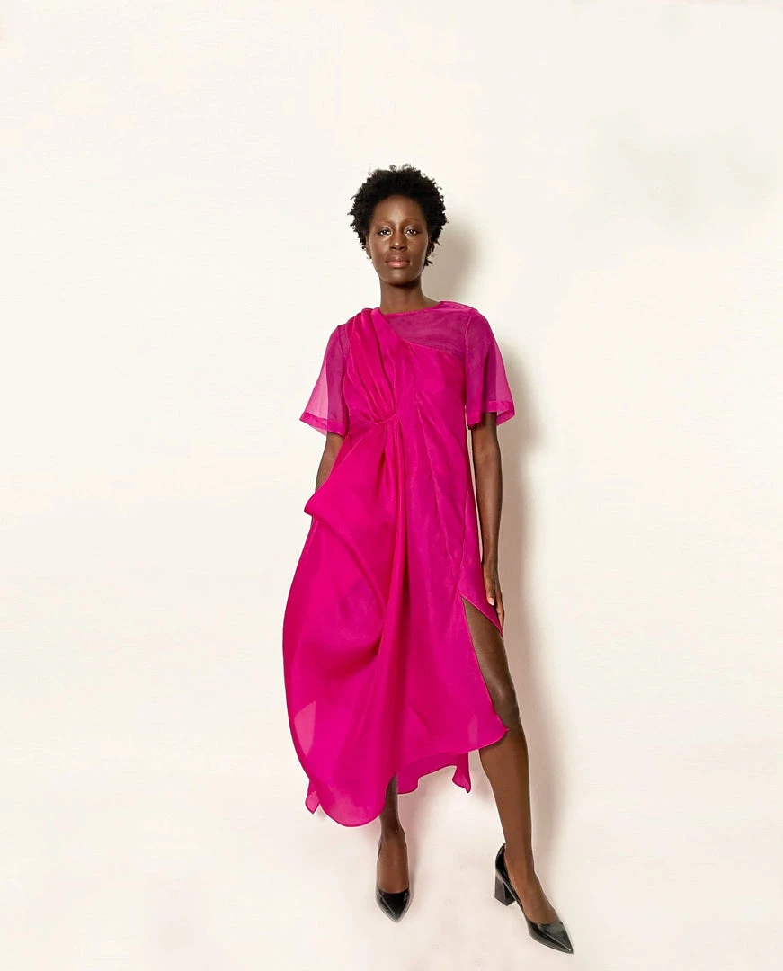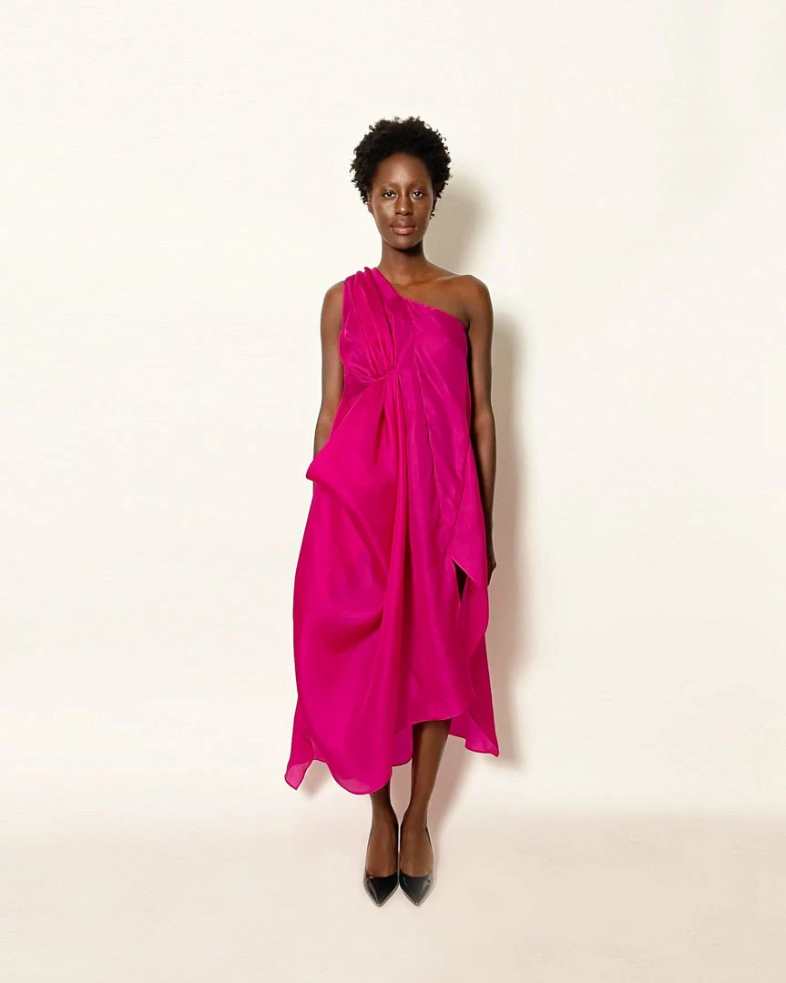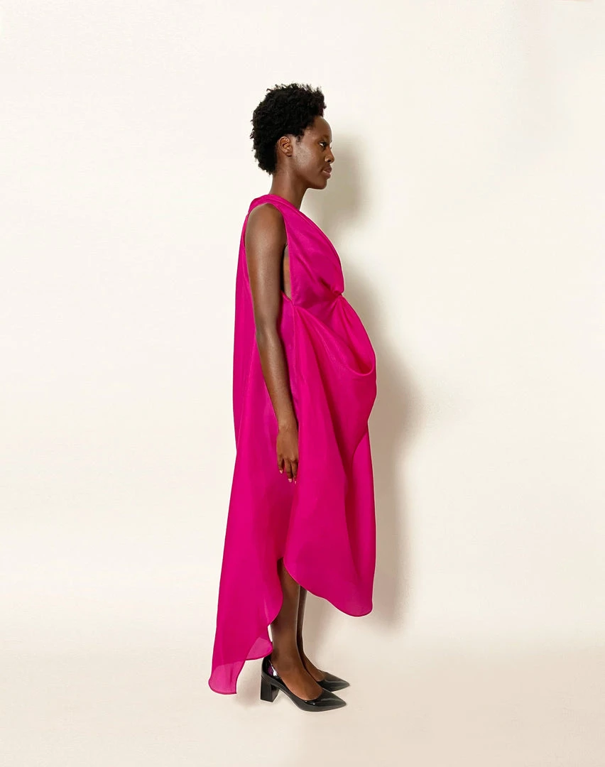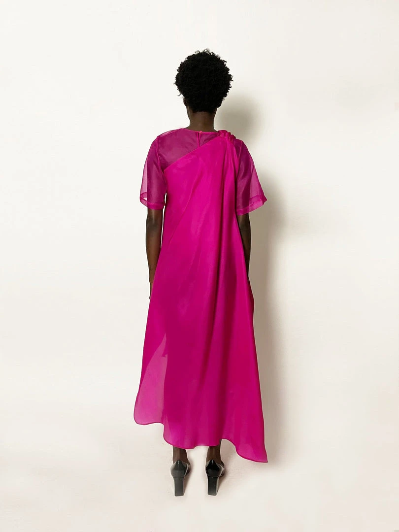 Sculptural folds of satin-faced silk organza form a snapdragon of a dress. One shoulder neckline, side slit, voluminous gathers that twist and fold, asymmetrical hemline. Styled with the Lin Organza Tee.