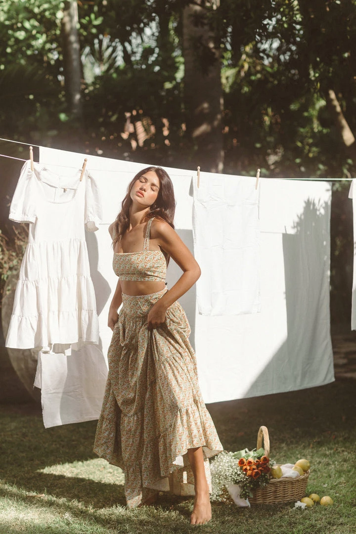 The Aruba Top is your easy, simple, yet not simple at all, crop. It features a custom lace trim along the straps and has smocking in the back making it both flirty and functional. Pair with our matching Lyford skirt to really make this look pop.