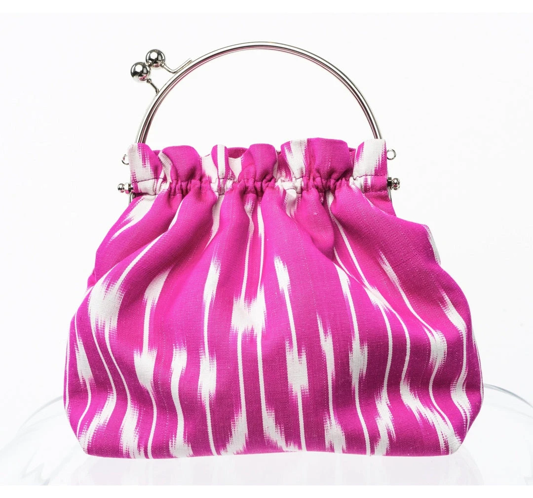 The PERFECT party purse!! Not too big, not too small – fits your phone, keys, lipstick and more! Inspired by Lark’s favorite Bermuda Bag from the 80s, the Ikat Party Purse is crafted from traditional silk ikat fabric combined with a non-traditional shape. Pairs wonderfully with the Basques scarf and bowtie!