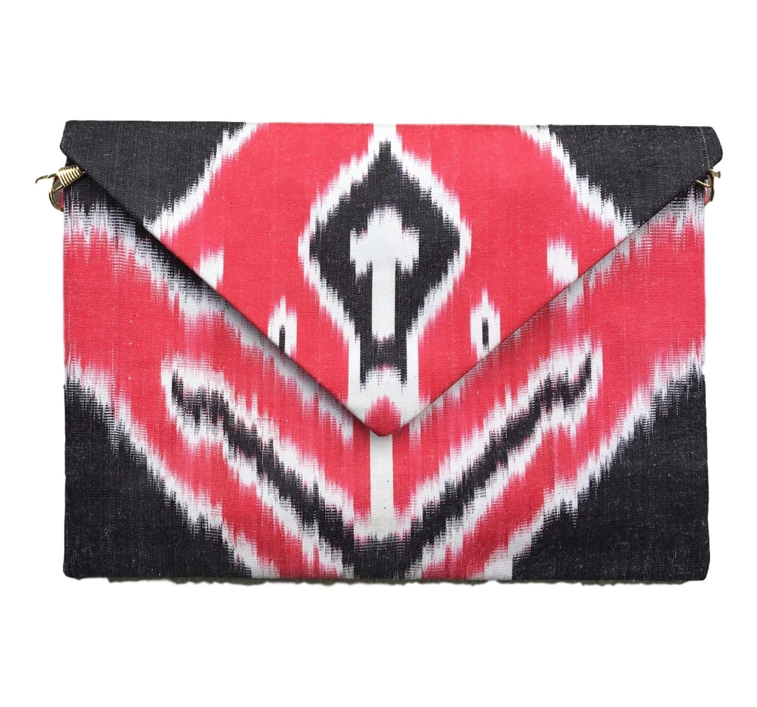 This purse is made from hand-loomed and hand-dyed silk in Uzbekistan. The craftsmanship of silk ikat has been handed down from generation to generation along the Silk Road. It can take up to a month to weave a single yard of this fabric! Truly a one of a kind textile treasure!