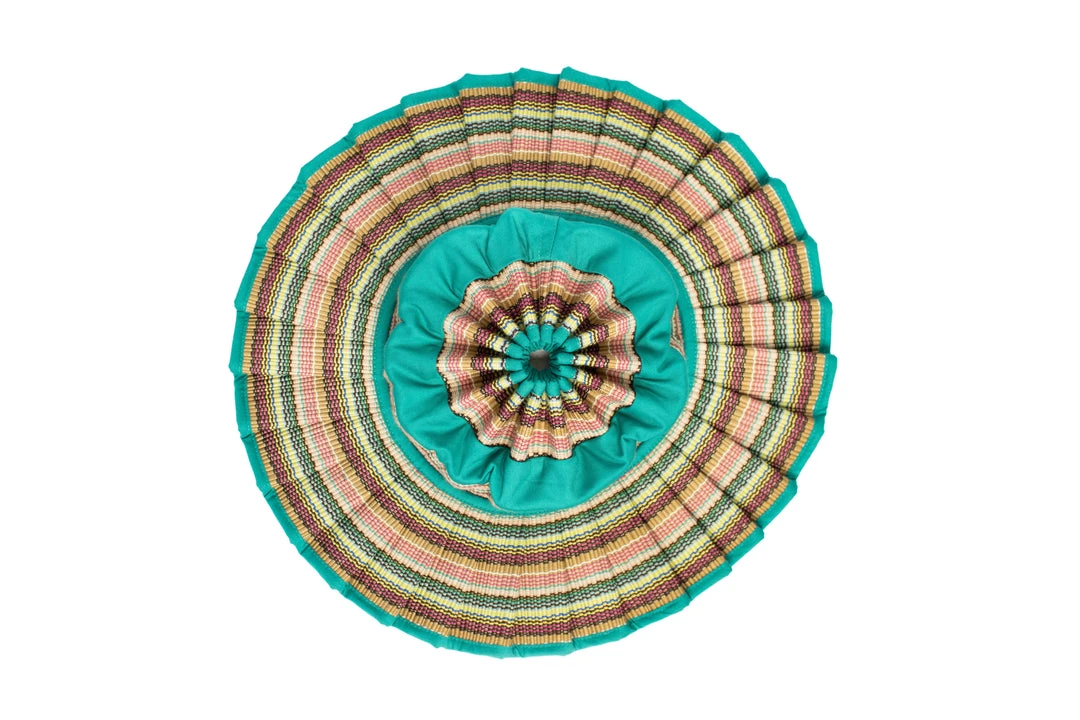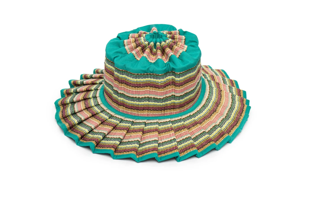 Beach House features a joyful blend of colours including pink, yellow, green, aqua, blue, caramel, dark brown and white, woven intricately in varying striped thicknesses in a horizontally striped pattern with bright teal fabric trimming.