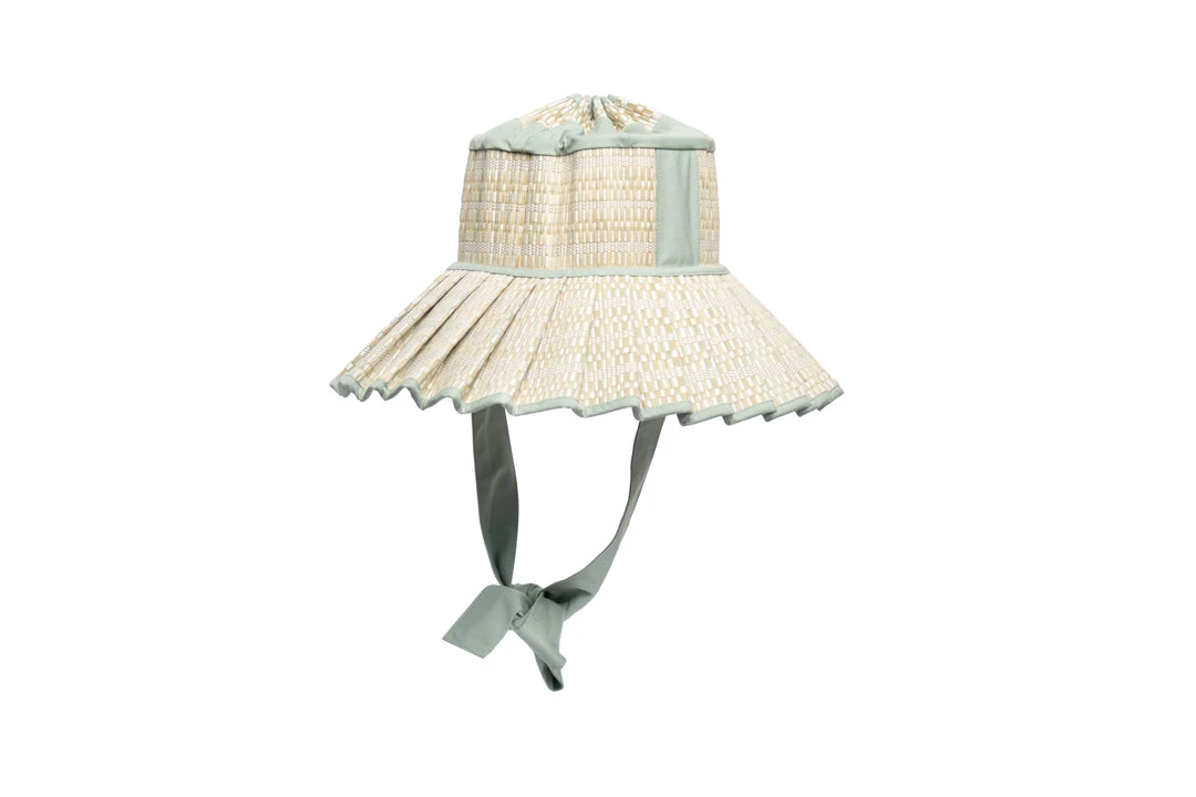 Polynesia features bands of vanilla coloured thread work woven in varying stripes through the natural fibre base, with pale-teal coloured fabric trimming.