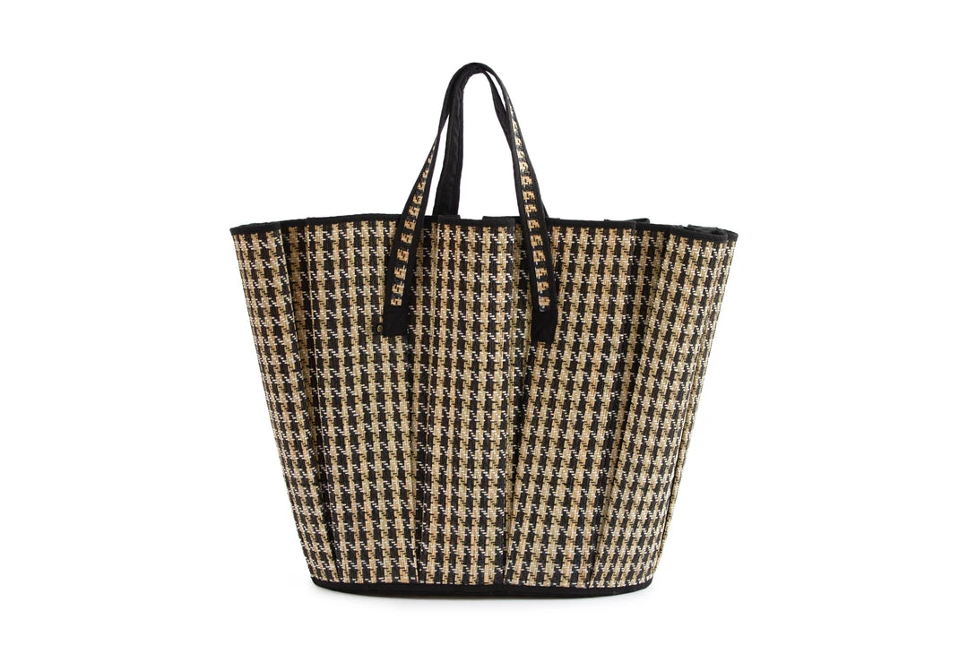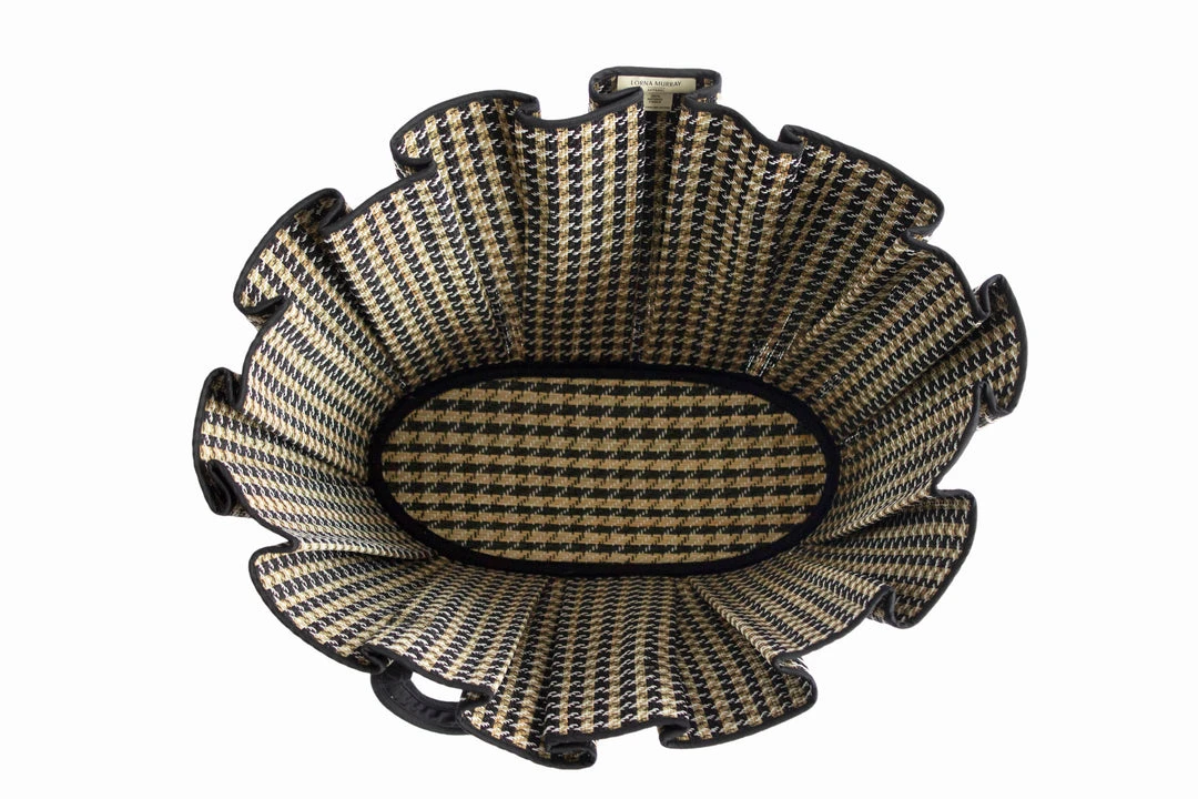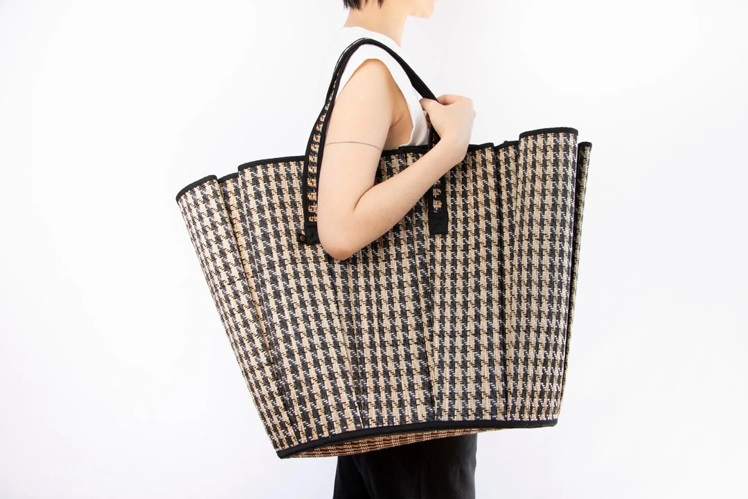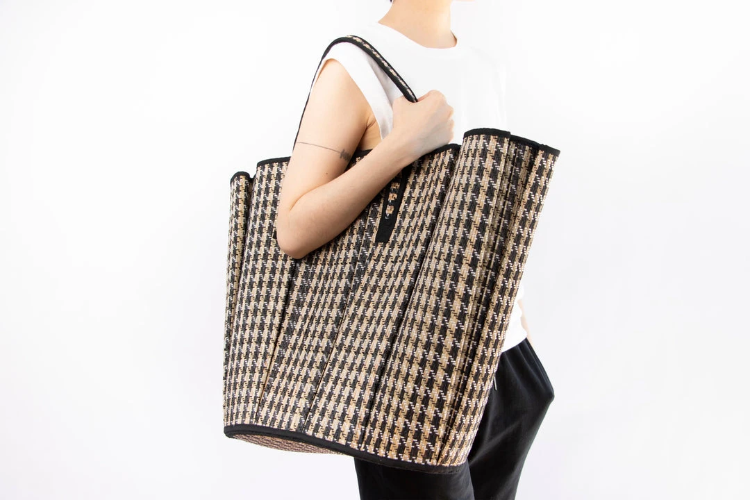 Roma features white and black alternating thread colours woven through its striped natural and black hand-dyed fibre base, with a black fabric trimming and a houndstooth inspired check pattern.