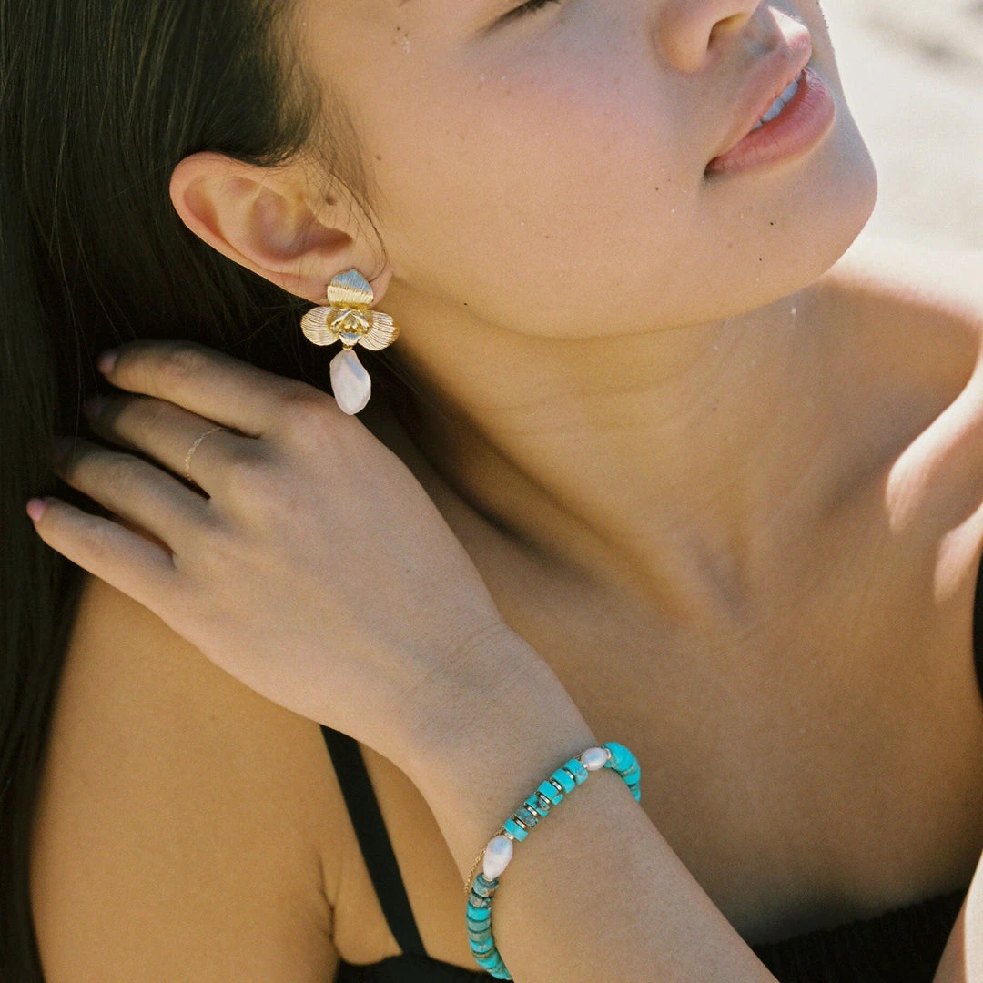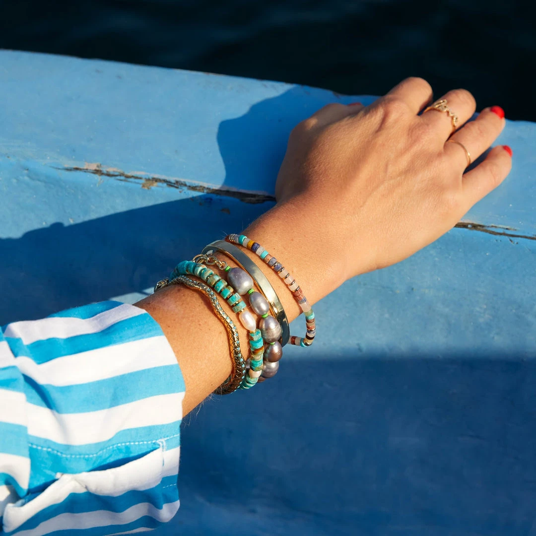 Wear alongside our serpent cuff, Maj bracelet, and Aama bracelets for the ultimate summer stack. This turquoise and freshwater pearl bracelet is both beautiful in color and significant in its symbolism of protection.