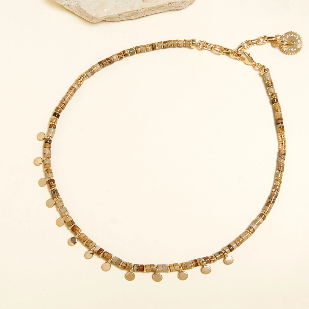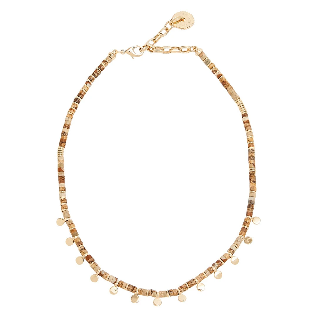 A necklace that feels showered by the sea, warmed by the sun and forever grateful. A stunning strand of jasper, gold beads, and gleaming golden discs–she was designed to be layered. Looks amazing atop tanned shoulders, to be worn all summer long.