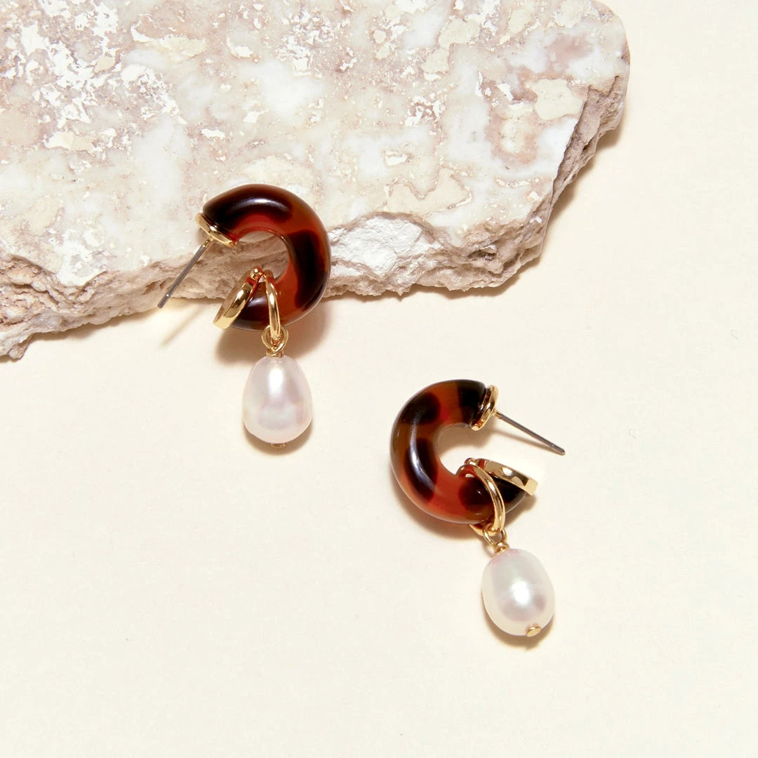 Swirled tortoiseshell resin in the perfect mini hoop. These have a pearl charm adornment that can be worn on or off, or asymmetrical should you choose! You get three ways to wear in this one style. We love the versatility of styling these and pairing with our Irina necklace or our Jody strand for two very different vibes.Â