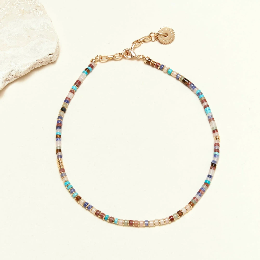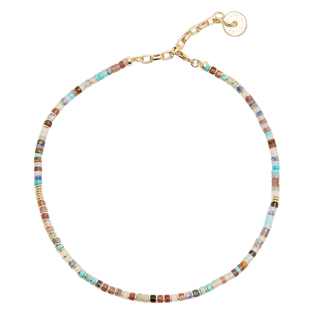 A semiprecious mix of turquoise, jasper, sodalite, and tiger eye, this necklace is cool worn alone or layered. We are channeling beachside bon fires with our layered strands mixed together.