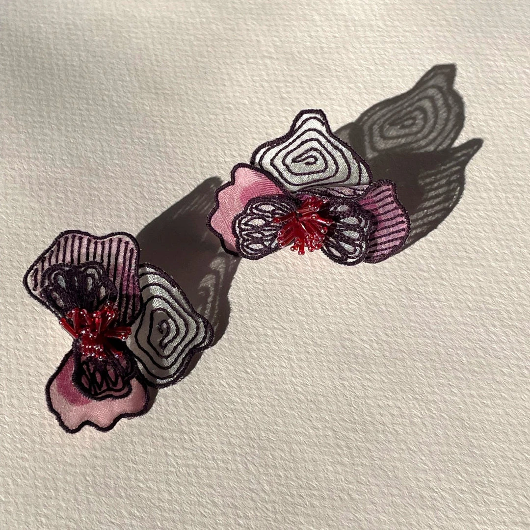 Exquisite blooms in a Rothko-like palette. These soft florals feature hand dyed watercolor organza petals with detailed bullion allowing for an artful luminescence that highlights the most detailed handwork.
