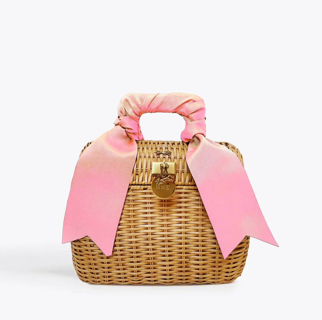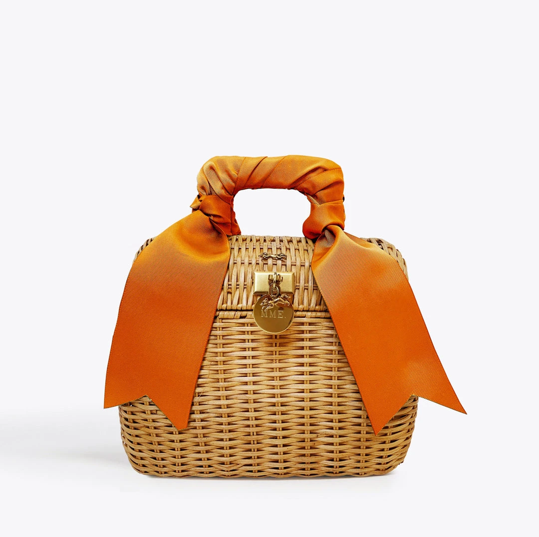 It’s time to CROQUET! Our exquisite basket Croquet Tote is this season’s fanfare piece. This bag’s clam-shell opening securely closes with hidden magnet feature and simple interior is lightweight organic cotton with slip pocket. Choose between Clementine Orange, Cornflower Blue, Tiffany, Rose Pink and Moss Green Ribbon.