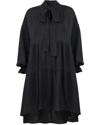 The Amanda Pussybow dress is a real statement piece. Its main feature – the pussybow neck – is amplified by a tiered, ruffled skirt that hits above knee length, and finished with ruffle details on the cuffs.