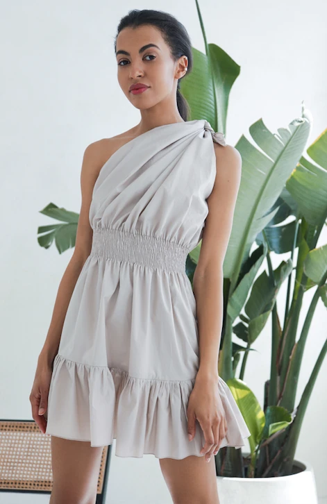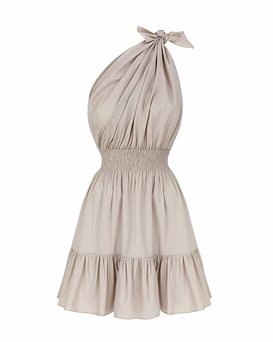 Made from our signature eco-cotton. Demi features a one-shoulder, asymmetrical halter neckline with a bow detail. A smocked elastic waistband creates an A-line silhouette.