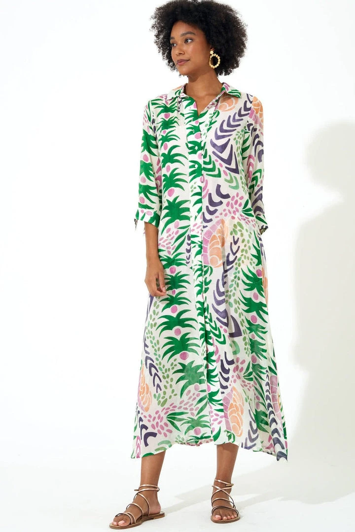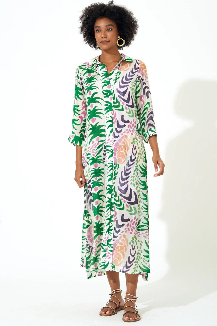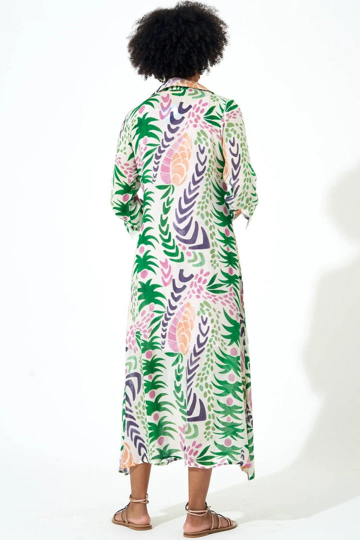 The Shirt Dress Midi is made from luxuriously soft silk and cotton, with button closures down the front and 3/4 length sleeves with tailored cuffs. Featuring a lively and colorful print that pops against a white background. This dress includes a removable slip, and can be styled as a beachside cover up, a dress, or a duster. Model is 5’8′ and wears a size small.