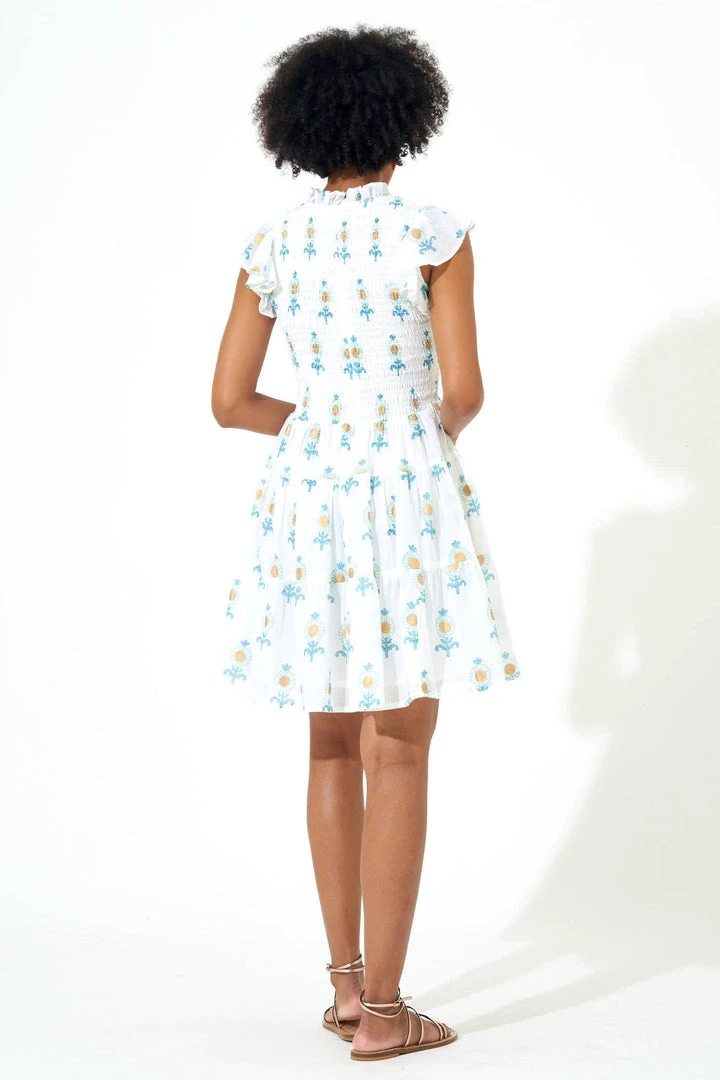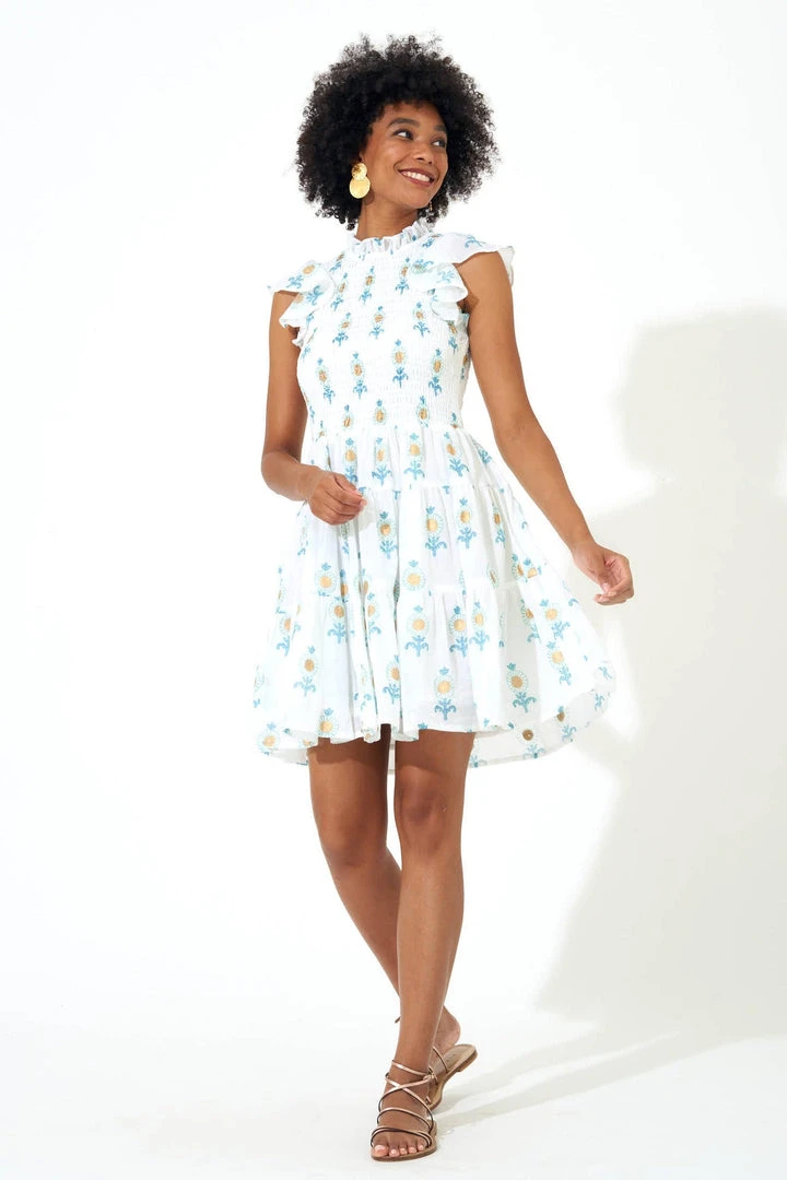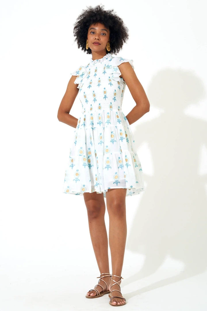The Smocked Flirty Short Dress is perfect for date night or your next special event. With smocked detailing throughout the top and beautifully crafted ruffle detailing along the sleeves and skirt, this dress is perfect for pairing with slides, sneakers, or a heel! Delicately hand-block printed in a minimal pattern with gold detailing and is made from Cotton Voile. Fully lined. Model is 5’9′ and wears a size Small.