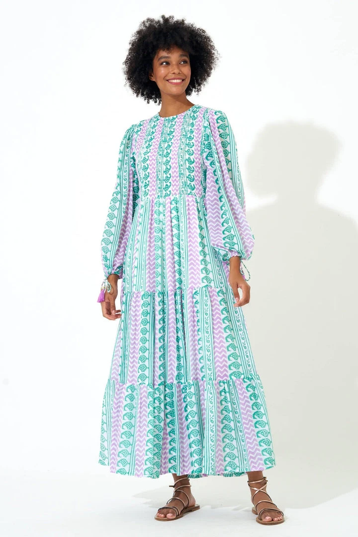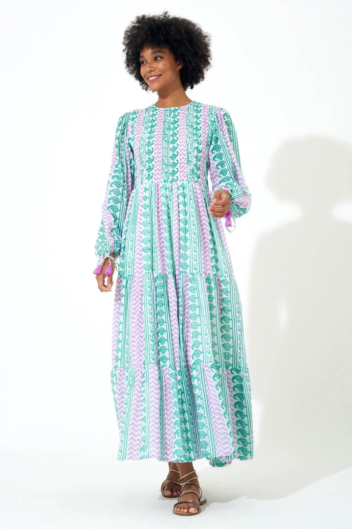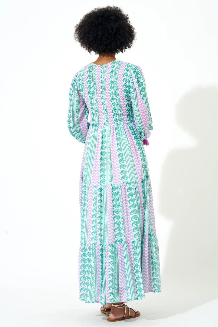 The magic is in the details with this beautifully crafted Smocked Top Maxi Dress, featuring a bright paisley printed across luxuriously light cotton voile fabric. The tiered skirt flows lightly and elegantly, with tassel tie accents displayed on the sleeves for added volume. Lined through the body. Model is 5’8′ and wears an XS.