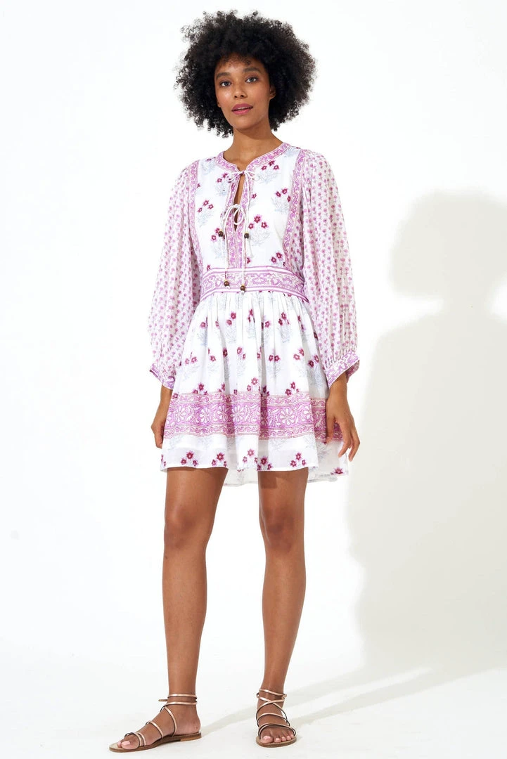 This Balloon Sleeve silhouette features tie front accents, beautiful trim detailing at the cuffs and hem, and is delicately stitched throughout the top