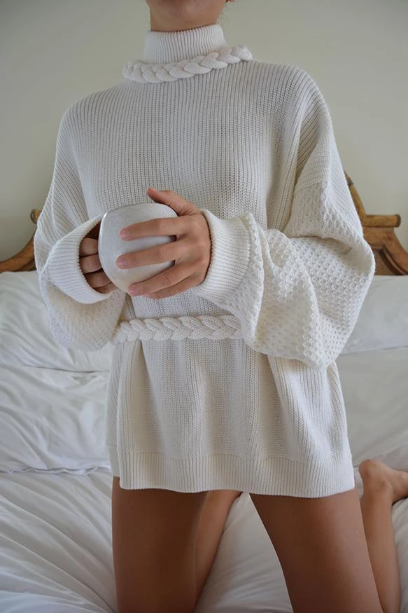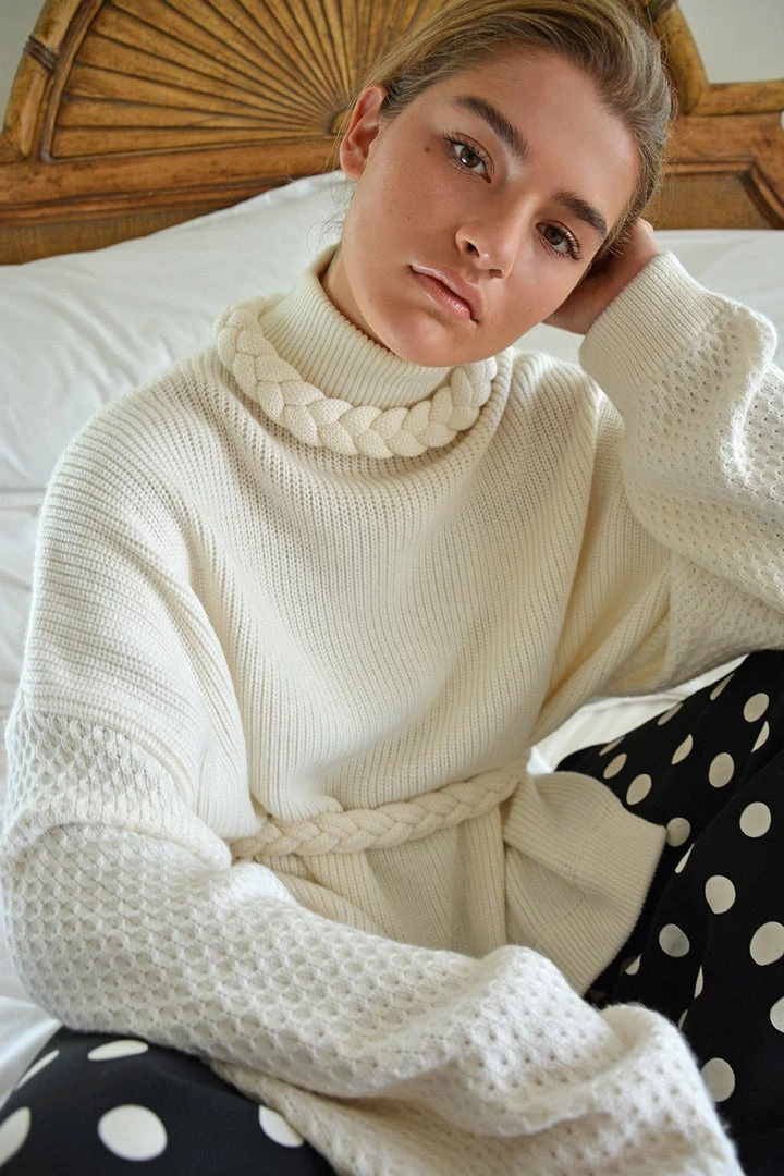 Meet the Belt Jumper in Ivory! The slouchy Sunday favorite made from super soft wool with signature braiding our around the neck.Â