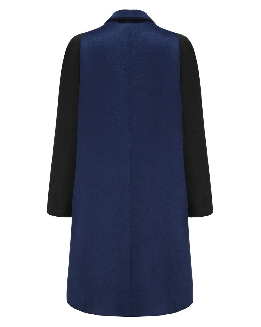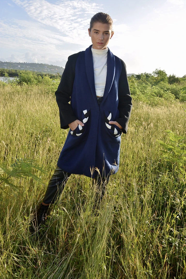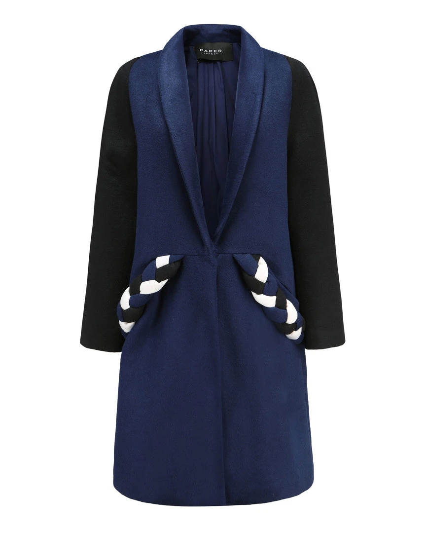 Meet the Plot Coat! The easy fitting, rounded midi length coat with plait detail over the pockets. The front closes with a concealed zip. Made in contrast Black and Navy soft and wool. For a snugger fit we recommend going to down a size from normal.Â