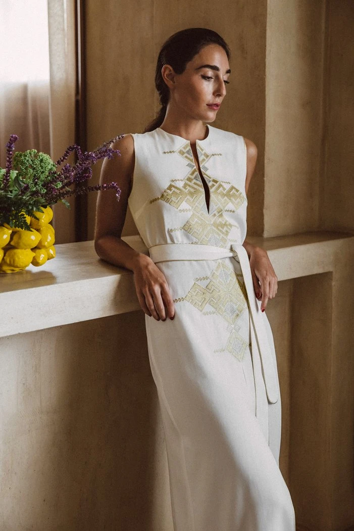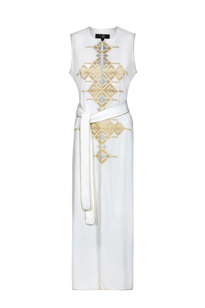 A timeless classic, the Aftab Dress is a straight-cut lightweight summer staple. Wear it like a kaftan or belted to cinch your waistline. Featuring gold and silver thread Balouch embroidery and gold trim, as well as a center midi slit for added comfort. Wear this piece all summer long with scrappy sandals or dress up with metallic heels.
