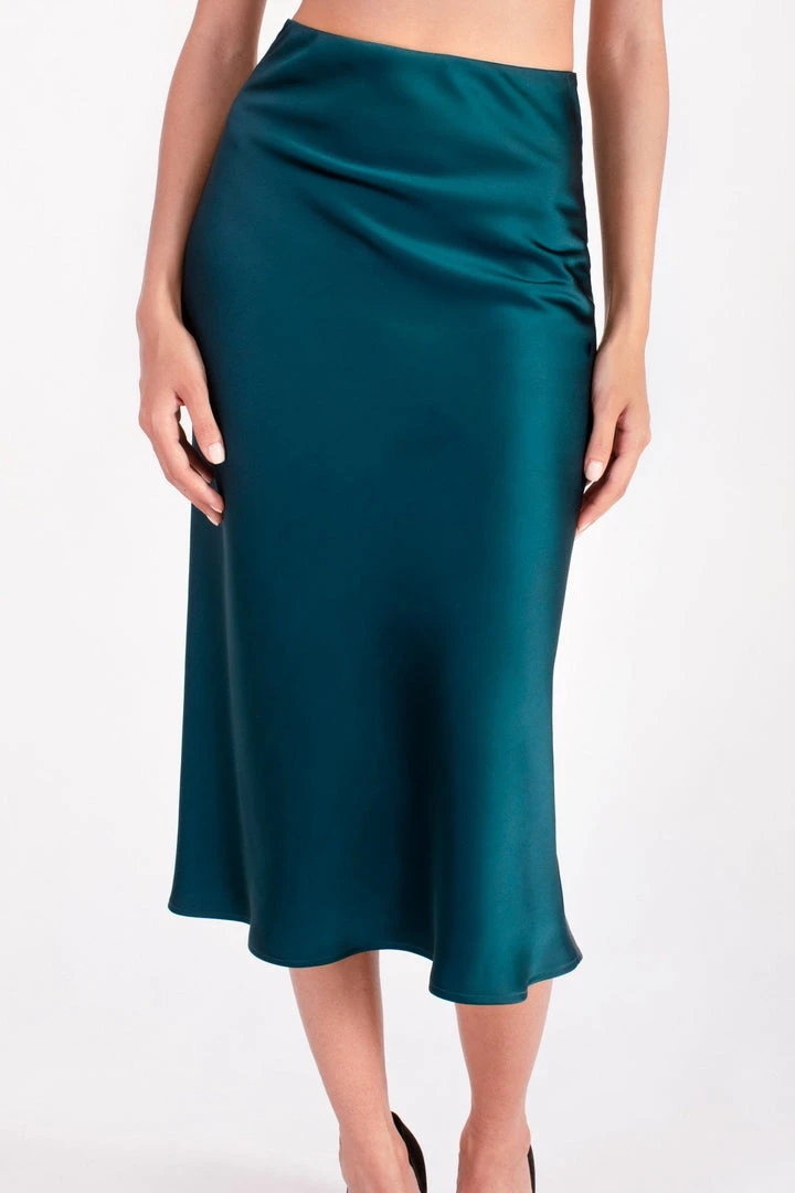 The most essential addition to any wardrobe is a perfectly cut lustrous midi slip skirt. Falling right below the knee with an elastic waistband, this will be your go-to piece for life. Pair with a simple camisole or a sweater on chillier days.