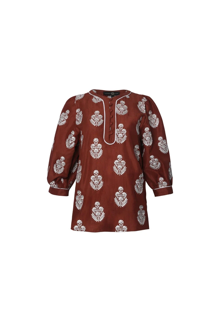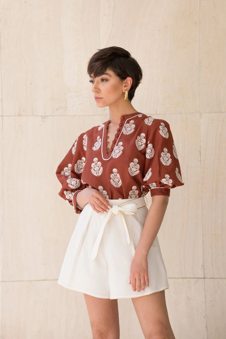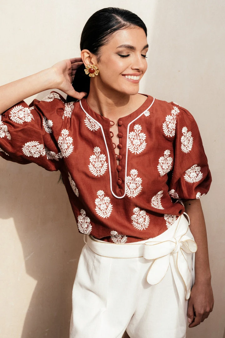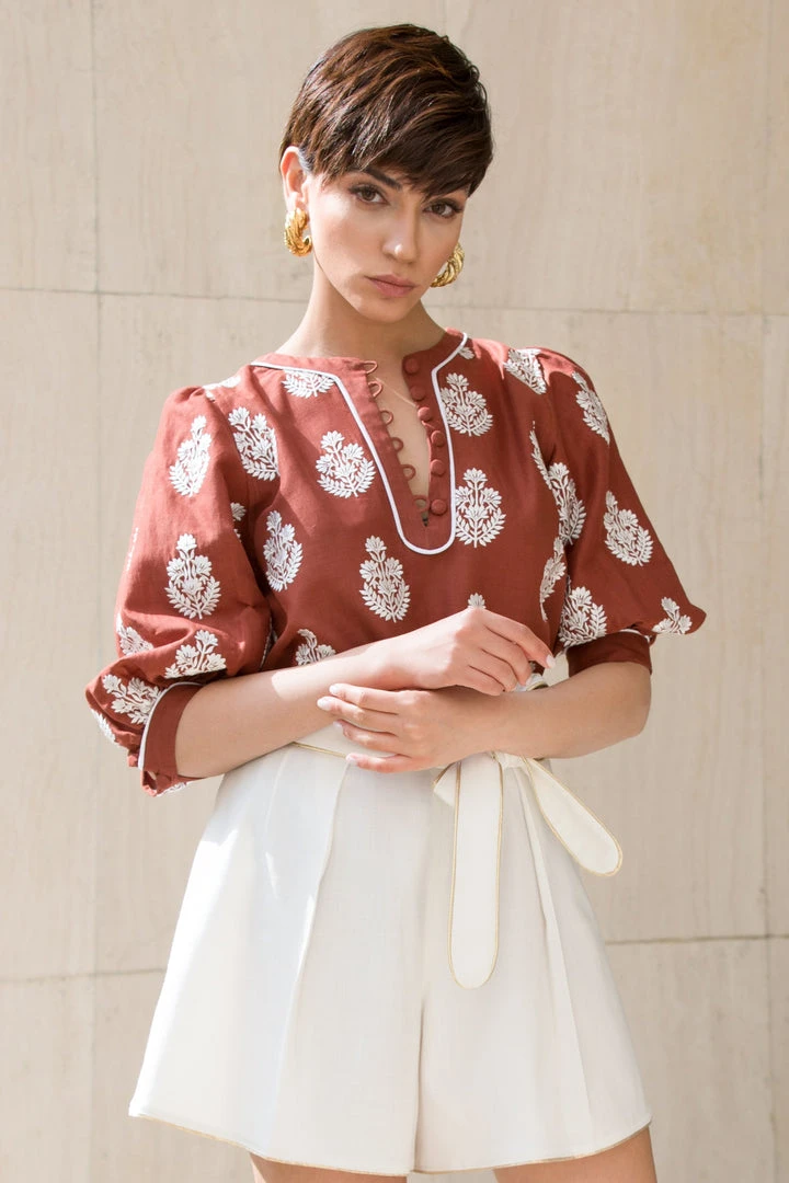 A beautiful lightweight linen blouse, featuring full Mughal-Inspired floral embroidery, quarter puff sleeves and a straight cut body. Tuck it in shorts or jeans for a casual chic look all summer long.