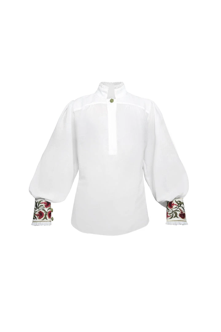 Cut from lightweight cotton voile fabric, the carnation blouse features a loose fit with our signature silk embroidered cuffs in a new carnation motif . One size fits all, making this loose fitting blouse a wardrobe staple that can be styled up or down for all occasions.