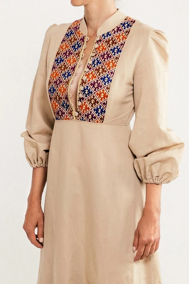 Our Gilan maxi dress is cut from sand-colored linen, featuring fine gold hand-embroidered bust and elegant poet sleeves.  The tapered waist and ruffled skirt enhance a feminine silhouette, making this the perfect go-to wardrobe staple.