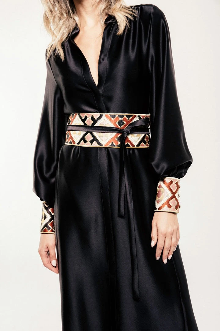With an elegant midi length, signature bell sleeves, and slightly tapered at the waist, this rich Black belted dress is a must-have Fall staple. Our Silk-blend material makes it the perfect dress to pair with high-boots in colder seasons, or with stilettos for spring.