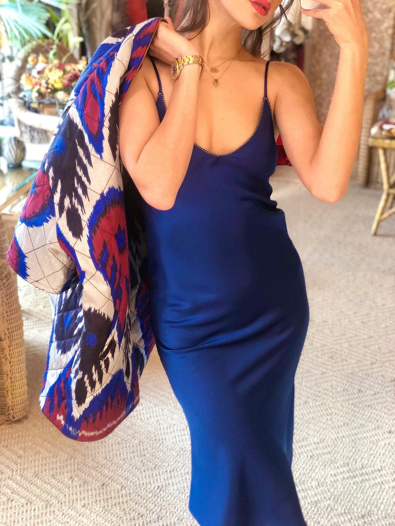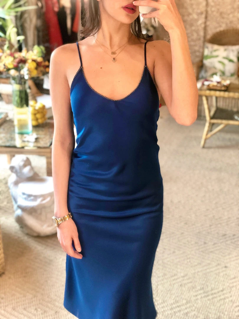 Strappy midi slip-dress, with gold thread stitching for an added flair.Â