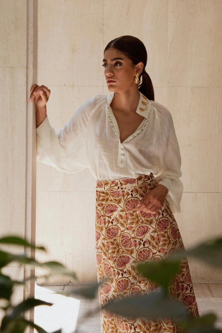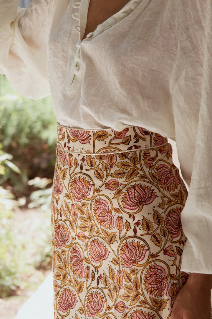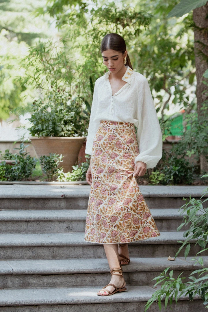 Made from 100% Cotton, these skirts have been Block printed using the ancient art of block-printing called ‘Ghalamkari’ using all natural dyes, featuring intricate Persian floral motifs. These midi skirts feature an A-Line silhouette and gold lame piping along the waistline and hemline. They are as timeless as they are unique, and can be dressed up or down as you please.